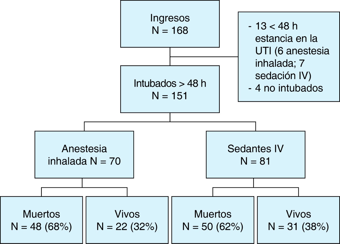 Se incluyen 151 pacientes, de los cuales 81 recibieron sedación intravenosa exclusivamente y 70 recibieron anestesia inhalada con o sin sedantes intravenosos en las primeras 48 horas de estancia en la UTI (Figura 1). Las características de ambos grupos se muestran en la Tabla 1. No hubo diferencia entre grupos en mortalidad hospitalaria (62% sedación intravenosa versus 68% anestesia inhalada, p = 0.443). Tampoco hubo diferencia en días de ventilación mecánica, días de estancia en la UTI y días de estancia hospitalaria.