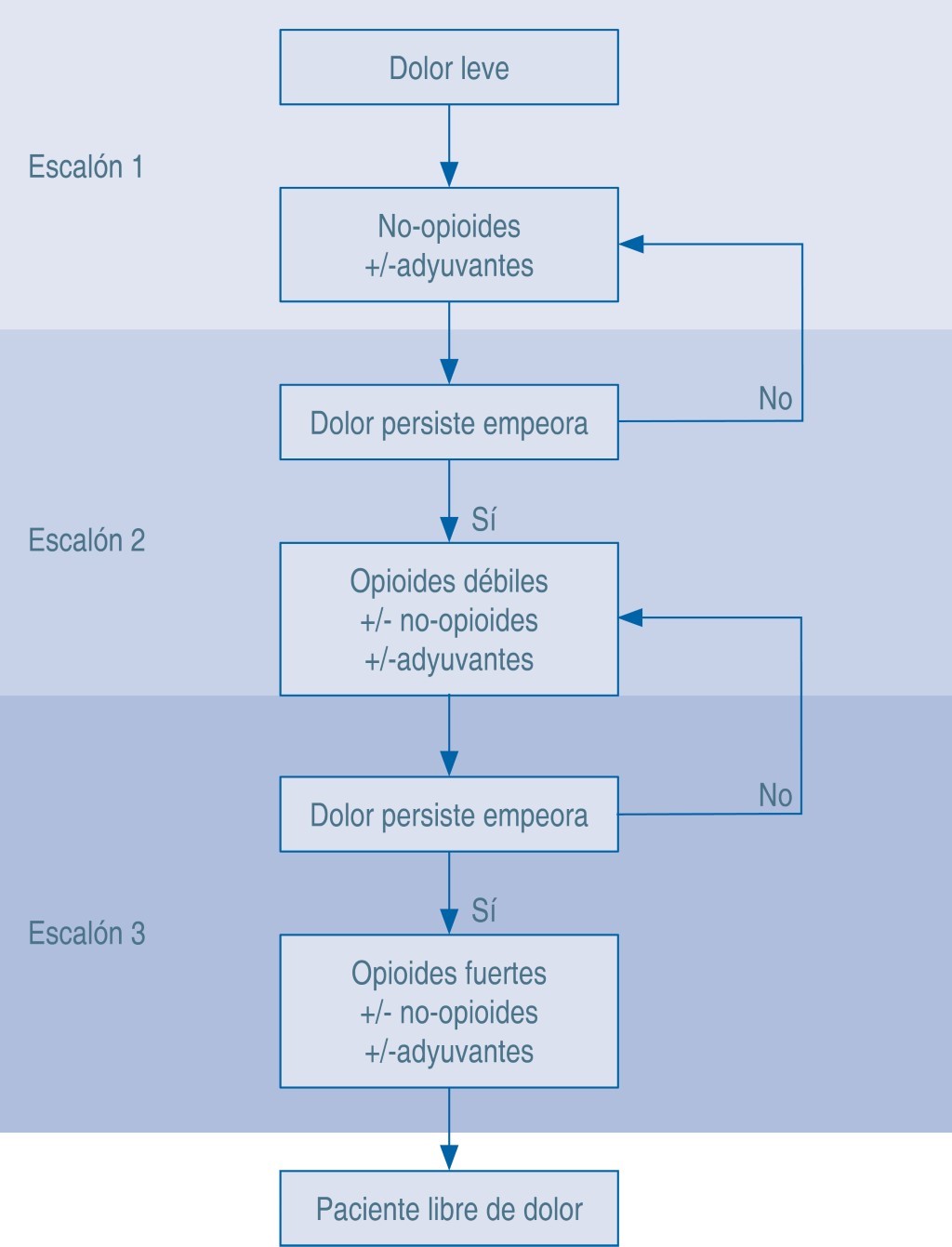 Por otro lado, al brindar tratamiento para el dolor, los profesionales de la salud deben fundamentarlo en su fisiopatología, y del empleo de medios que permitan hacer una valoración de su origen y evolución. Las guías para el manejo del dolor de la OMS ofrecen recomendaciones generales, tales como la administración de analgésicos; por ejemplo, siempre que sea posible deberá prescribirse por vía oral. Además, los analgésicos deben administrarse en intervalos de tiempo fijos, y la siguiente dosis debe administrarse antes de que concluya el efecto de la dosis anterior. Finalmente, se recomienda que las dosis sean individualizadas, y que su incremento o disminución sea acorde con las manifestaciones de cada paciente.9
