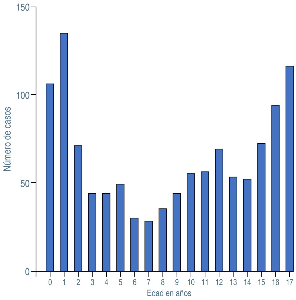 Características demográficas. Los pacientes masculinos comprendieron 50.7% (n = 584); el promedio de edad fue 8.5 ± 6.0 años, registrando pacientes desde recién nacidos hasta de 17 años. En la Figura 1 se describe el número de casos de acuerdo con la edad; como se observa, la edad de presentación más frecuente fue entre los niños ≤ 2 años y en los mayores de 12 años.