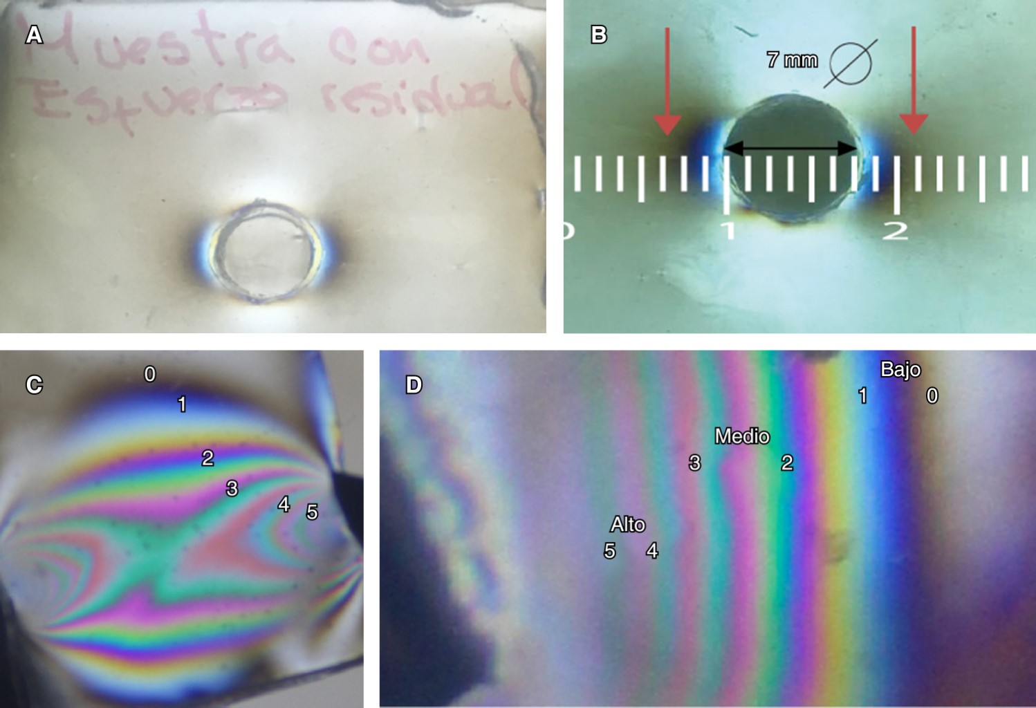 Las bandas isocromáticas muestran la tensión en colores y grosores diferentes; entre más anchas sean el estrés es más bajo y entre más delgadas y continuas es mayor. En la Figura 1C se muestra la escala de color que exhibe la resina utilizada, se codificó de acuerdo con lo reportado en la literatura del 0 al 5; donde 0 y 1 corresponden a un estrés bajo, 2 y 3 medio y 4 y 5 alto (Figura 1D).
