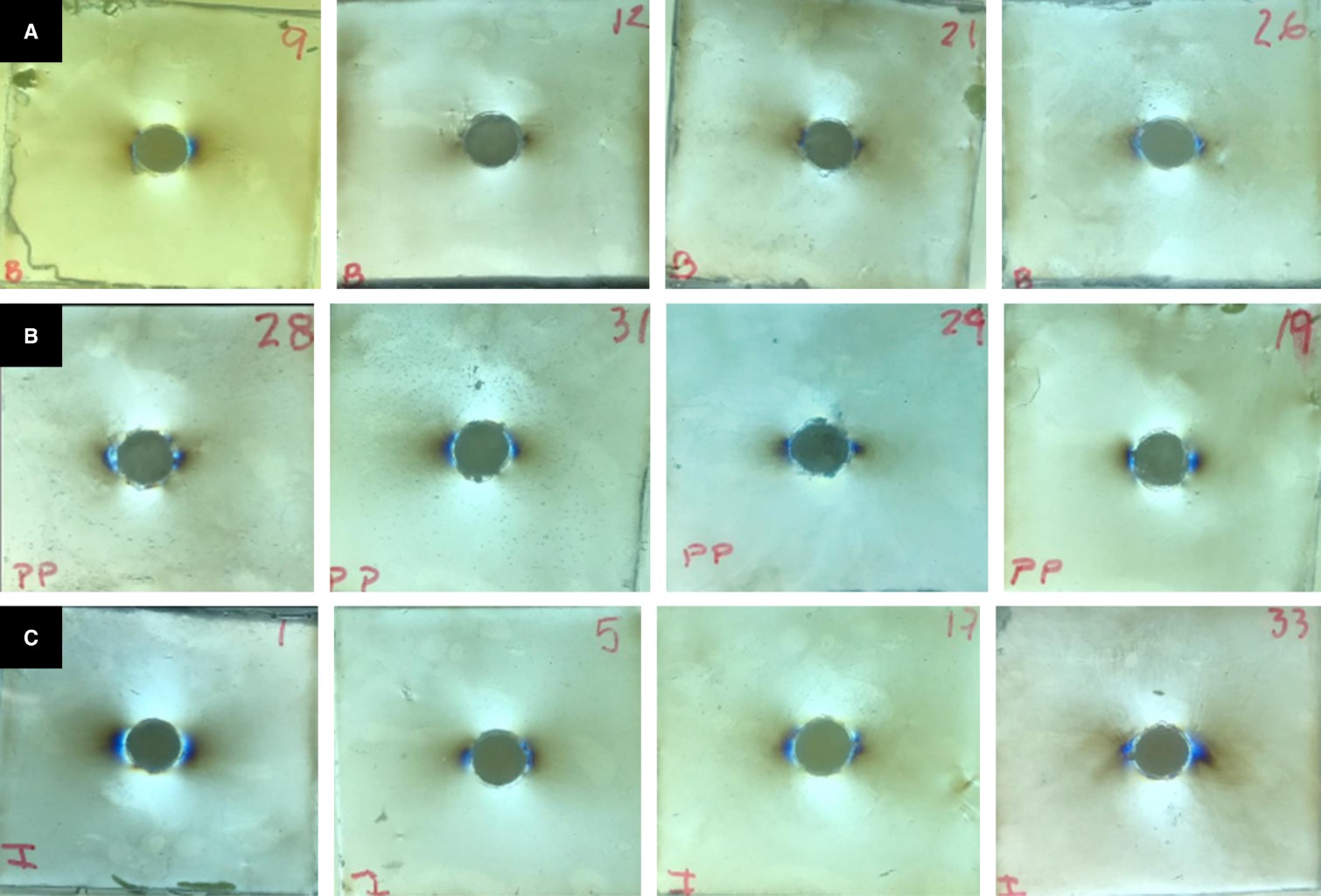 La preparación de los moldes de resina fotoelástica consistió en matrices de silicona; se realizaron moldes cuadrados de 5 × 5 × 4 mm, al centro con una cavidad circular de 7 mm de diámetro y 2.5 mm de profundidad. Se vaciaron en resina epóxica Cristal Líquido AWS 520 de Epolyglas México. El orificio de un lado del molde quedó cerrado con la misma resina y del contrario completamente libre. Antes de la prueba, se verificó que no existieran líneas de concentración de esfuerzos residuales alrededor del orificio, aquellas muestras que los presentaron fueron eliminadas (Figura 1A). Se numeró cada molde y se dividieron en tres grupos. Posteriormente, con ayuda de una espátula con recubrimiento de teflón, se obturaron las cavidades hasta el borde superficial de la cavidad con las diferentes técnicas; al llegar a dicho borde, se colocó una cinta de celuloide y se procedió a fotocurar. Se obturó de acuerdo a la técnica correspondiente para cada grupo:
