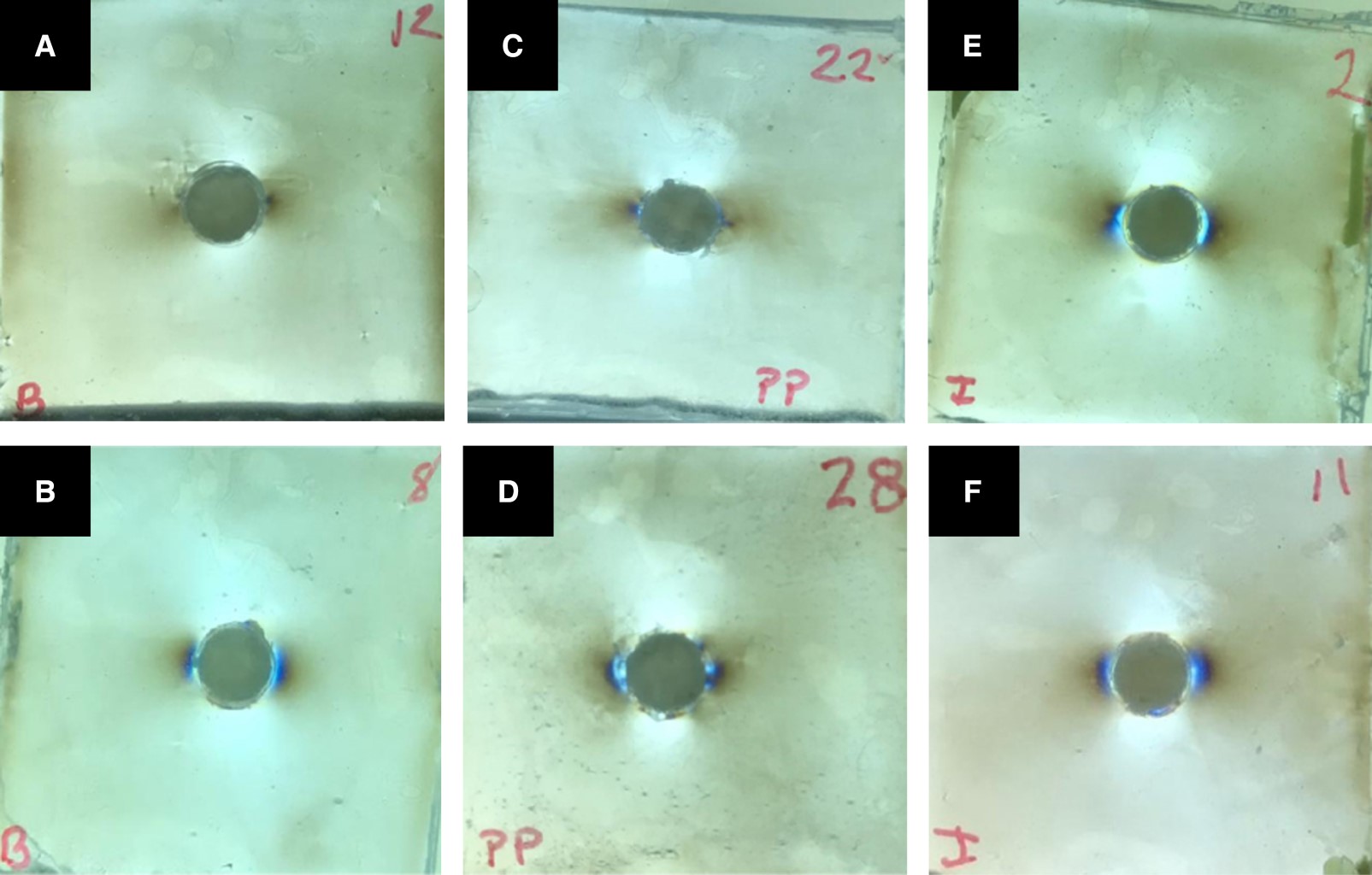 El grupo 1, obturado con la técnica en bloque, mostró los resultados más bajos de estrés en las paredes: el 40% de las muestras presentaron sólo la primera banda isocromática (negra) correspondiente al valor más bajo de estrés (Figura 3A y B). Tanto el grupo 2 (técnica incremental pared por pared) (Figura 3C y D) como el grupo 3 (técnica de incrementos oblicuos) (Figura 3E y F) mostraron resultados de estrés similares; en el grupo 2 alrededor del 10% de muestras sólo mostraron la banda negra y en el grupo 3, considerado el de valor más alto de estrés, todas las muestras exhibieron a partir del nivel 1, es decir de la banda azul. Los grupos 2 y 3 mostraron diferencias estadísticamente significativas al comparar cada técnica con el grupo 1 (p = 0.002 y p = 0.000, respectivamente). No se encontraron diferencias estadísticamente significativas entre los grupos 2 y 3.