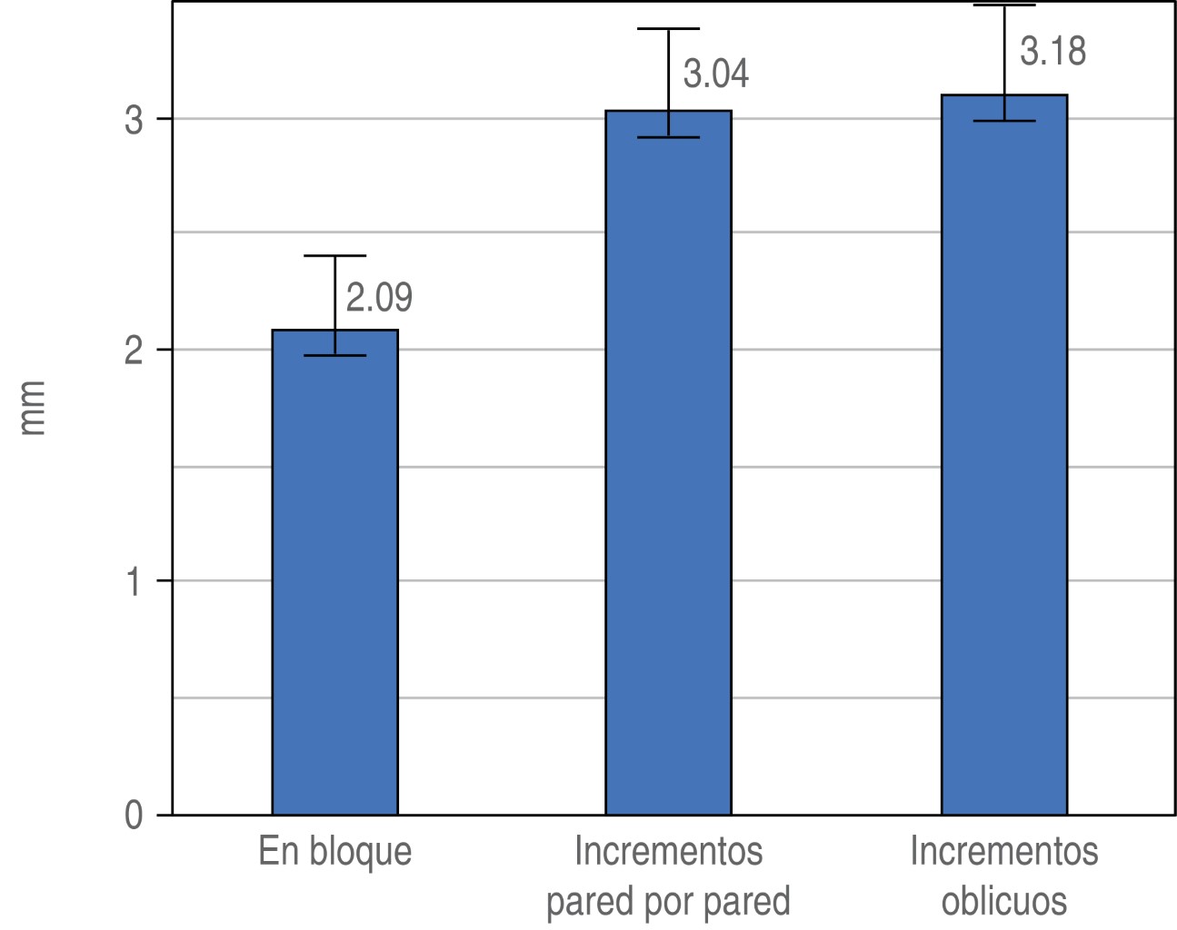 1. Técnica de llenado en bloque: la cavidad se llenó con la resina en su totalidad y se fotocuró durante 40 segundos. 2. Técnica incremental pared por pared: se colocaron incrementos que abarcaron sólo una pared con un grosor aproximado de 1.5 mm, fotocurando cada uno antes de colocar el otro durante 20 segundos, hasta llenar la cavidad. 3. Técnicas de incrementos oblicuos: se colocaron incrementos oblicuos partiendo de una de las paredes, extendiendo y reduciendo la altura del incremento desde un grosor máximo de 1.5 mm, uno sobre otro hasta llenar la totalidad fotocurando entre cada uno por 20 segundos (Tabla 1). Se utilizó la lámpara Elipar de 3M (longitud de onda 430-480 nm e intensidad de 1,200 mW/cm2), la lámpara de fotopolimerizado fue calibrada con radiómetro para verificar la intensidad cada cinco muestras y la distancia de fotocurado fue constante a 2 mm del borde de la muestra de resina.
