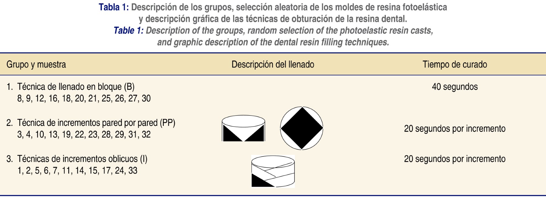 En odontología, esta técnica ha sido aplicada para analizar los esfuerzos generados en las paredes de las cavidades dentales asociados a la contracción por polimerización que se genera en las resinas compuestas.10 El objetivo de la presente investigación es comparar el estrés por polimerización de tres diferentes técnicas de obturación de resinas dentales, por medio de la fotoelasticidad, para determinar cuál de las técnicas genera menos estrés a las paredes de la preparación.
