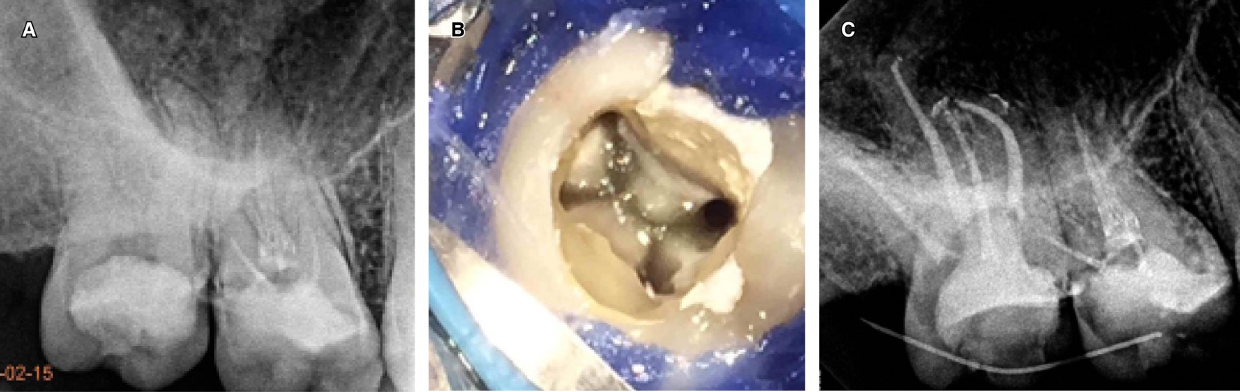 Después de la técnica de anestesia local con lidocaína con epinefrina al 1:80,000, el tratamiento de conductos se realizó con aislamiento absoluto con dique de hule y aumento a través de lupas (3.5x). La cavidad de acceso se efectuó con fresas de carburo y fresas Endo-Z (Dentsply Maillefer, Ballaigues, Suiza). No se observó presencia de grietas o líneas de fractura. Al principio se ubicaron tres conductos radiculares utilizando un explorador DG16 (Hu-Friedy, Chicago, IL, USA), pero el conducto palatino se localizó más distalmente de lo normal, y eso hizo sospechar al operador de la presencia de un conducto radicular adicional. Por lo tanto, se realizó una inspección cuidadosa del piso de la cámara pulpar y se amplió ligeramente la cavidad de acceso en sentido mesiopalatino. Una vez localizados los cuatro conductos radiculares, se negoció cada uno con una lima 10/02 (Dentsply Maillefer, Ballaigues, Suiza). Se tomó la longitud de trabajo con un localizador de ápices (Root ZX, J. Morita, Tokio, Japón) y se confirmó con una radiografía dentoalveolar digital. La instrumentación se realizó con el sistema Reciproc® (VDW, Alemania) con la técnica sugerida por el fabricante y se complementó con el sistema Mtwo® (35/05) (VDW, Alemania). Se utilizó el mismo protocolo de instrumentación para los cuatro conductos radiculares. La desinfección se realizó con NaOCl a 5,25% activado por ultrasonido (tres ciclos de 20 segundos) y EDTA a 17% (Asia Chimi Teb, Teherán, Irán). Después de la irrigación con EDTA se irrigó con solución salina al 0.9% para desactivar al EDTA. Por último, se usaron 20 mL de NaOCl al 5.25% para irrigar cada conducto radicular utilizando un sistema de presión negativa apical como el Endovac® (SybronEndo), esto como protocolo de irrigación final. La técnica de obturación se realizó mediante la compactación de onda continua y sellador AH + (Dentsply Maillefer, Ballaigues, Suiza) (Figura 1A-C).