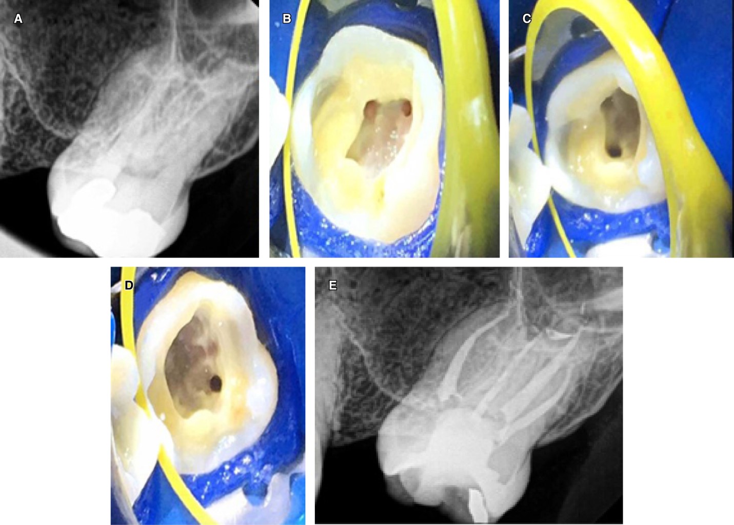 Caso 2Se presentó una mujer de 28 años de edad con antecedentes médicos no contributivos con dolor a los cambios térmicos en el segundo molar maxilar derecho. Clínicamente, se observó la presencia de una amalgama fracturada y caries profunda. Desde el punto de vista radiográfico, el ancho del espacio del ligamento periodontal (PLS) era normal y no había patología periapical. Hubo una respuesta prolongada al frío y una prueba de percusión vertical positiva, con ausencia de bolsas periodontales. El diagnóstico pulpar fue pulpitis irreversible sintomática y el diagnóstico periapical fue de periodontitis apical sintomática. Después de la técnica de anestesia local con lidocaína con epinefrina al 1:80,000, el tratamiento se realizó con aislamiento absoluto con dique de hule y aumento con lupas (3.5x). La amalgama se retiró con fresas de diamante y luego la cavidad de acceso se diseñó con fresas de carburo y puntas ultrasónicas Star X (Dentsply Sirona). La cavidad de acceso tenía un diseño cuadrangular y se ubicaron cuatro conductos radiculares. Cada uno de los cuatro conductos se negoció una lima k10/02 (Dentsply Maillefer, Ballaigues, Suiza) precurvada. Se tomó la longitud de trabajo con un localizador de ápices (Root ZX, J. Morita, Tokio, Japón) y se confirmó con una radiografía dentoalveolar digital. Para la instrumentación de los conductos radiculares se usó el sistema Mtwo® (VDW, Alemania). Los conductos vestibulares fueron instrumentados a 35/04 y los dos conductos palatinos a 40/04. El protocolo de irrigación y la técnica de obturación fueron los mismos que en el caso anterior (Figura 2A-E).