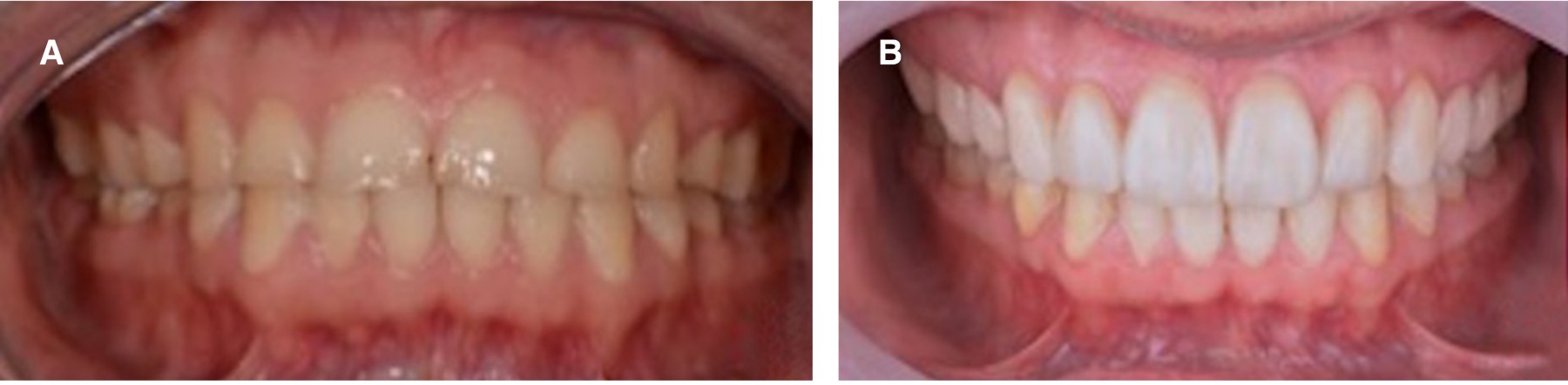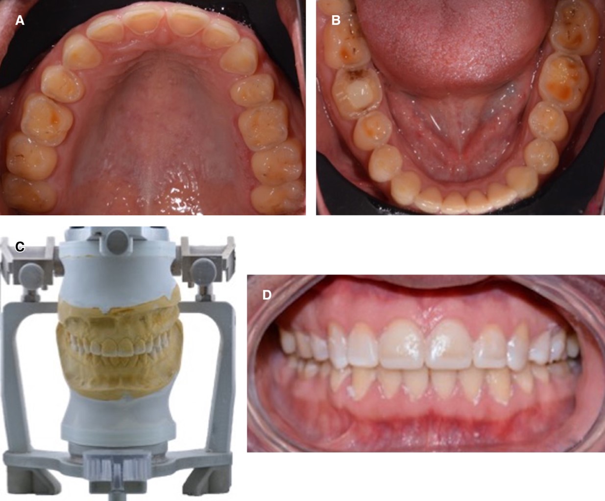 Paciente masculino de 32 años de edad, quien se dedica a la atención de un restaurante. Acudió a la clínica odontológica del postgrado de la Universidad Autónoma de Guadalajara y comentó que el motivo principal de la consulta fue que tenía los dientes muy desgastados y presentaba sensibilidad en algunos de ellos (Figura 1A-B). El paciente afirmó ser obsesivo compulsivo y padecer el síndrome de Tourette, el cual es un trastorno neuropsiquiátrico de desarrollo en el inicio de la infancia, que se caracteriza por movimientos y vocalizaciones breves, estereotipadas, pero no rítmicas, semejantes a "sacudidas" que son llamadas "tics". En el momento de la consulta, refirió que no tomaba medicamentos para su padecimiento porque los dejó de consumir desde hacía cinco años. La salud del paciente fue considerada como buena y no presentaba ningún tipo de alergia.