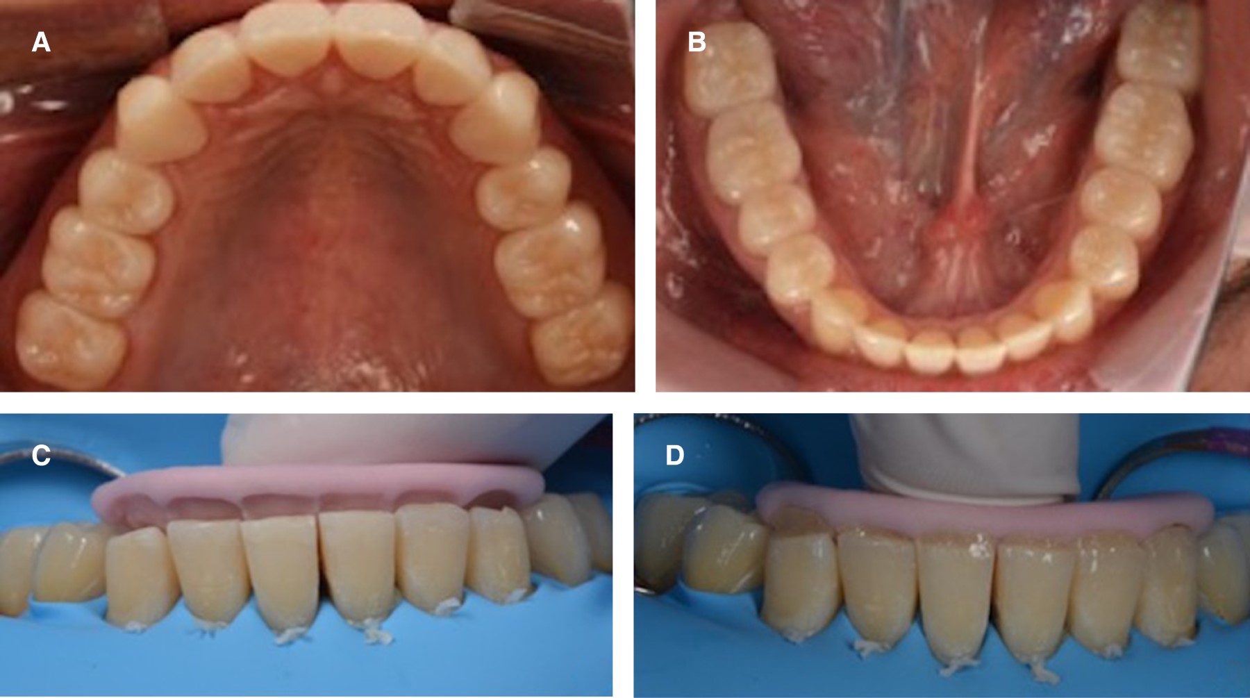 Para el acondicionamiento de las restauraciones se colocó en su parte interna ácido fluorhídrico al 5% por 20 segundos, se lavaron y se colocaron las restauraciones en agua destilada en ultrasonido por cinco minutos y se aplicó silano. Se empleó una capa de resina adhesiva seguida por un suave y tenue flujo de aire, y se procedió a colocar lentamente siguiendo el eje de inserción del diente con presión digital, se eliminaron excedentes con un pincel y se polimerizó por 60 segundos. Se utilizó un gel de glicerina y se fotocuró nuevamente. Se revisó la oclusión y se continuó con la toma de impresión de la zona posterior con la misma técnica de impresión y con los mismos materiales. Las restauraciones se elaboraron de la misma forma y se adhirieron con el mismo protocolo (Figura 2A-B). Para la zona anteroinferior se colocaron bordes incisales con resina compuesta, elaborados con aislamiento absoluto y una llave de silicón basada en el encerado, de esta forma se preservó al máximo la estructura dentaria (Figura 2C-D). Mediante desgastes mínimamente invasivos y sólo dando espacio necesario para el material restaurador, se obtuvieron grandes resultados estéticos y funcionales que preservaron el tejido dental sin aumentar demasiado la DVO del paciente (Figura 3A-B).