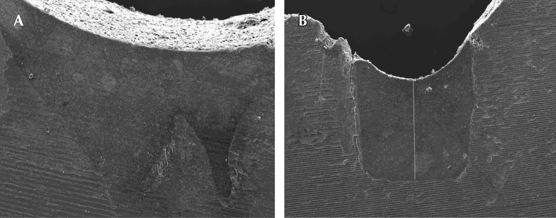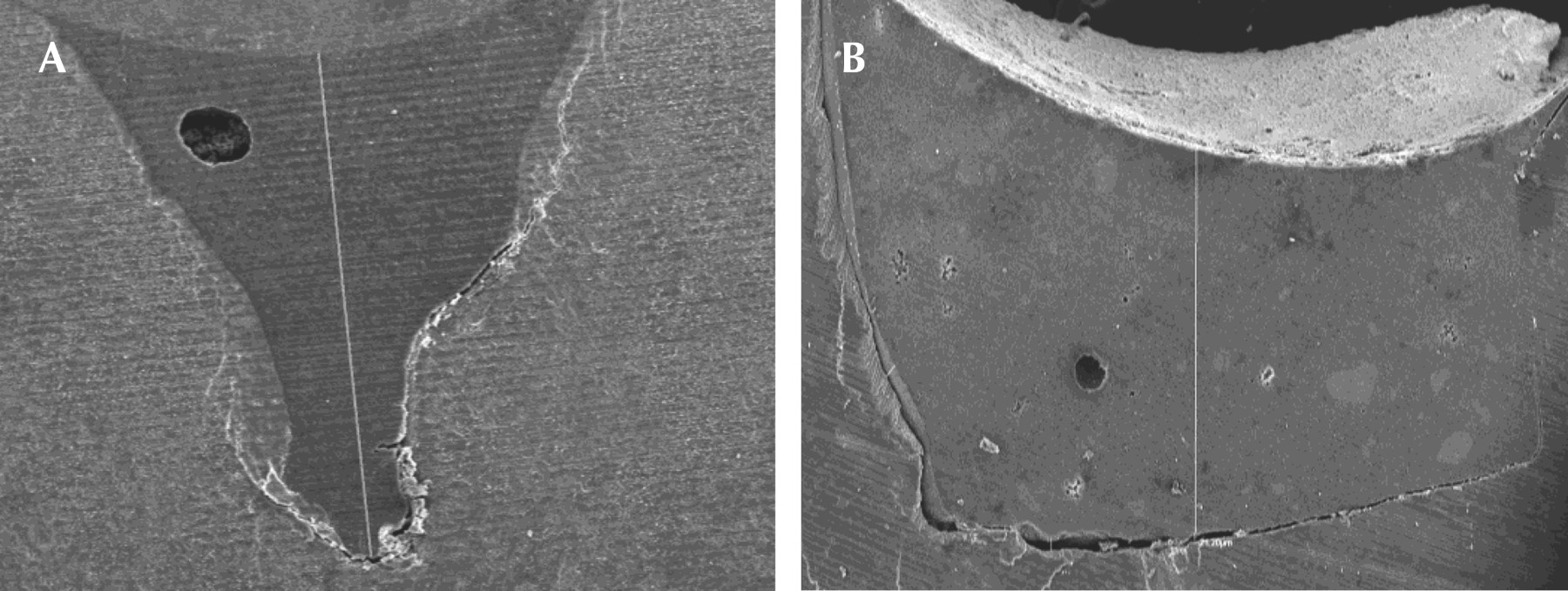 Examinadas las muestras en el MEB, se observó en 16% una adaptación íntima del material a las paredes del surco, el restante 84% mostró una adaptación parcial con zonas de desadaptación.