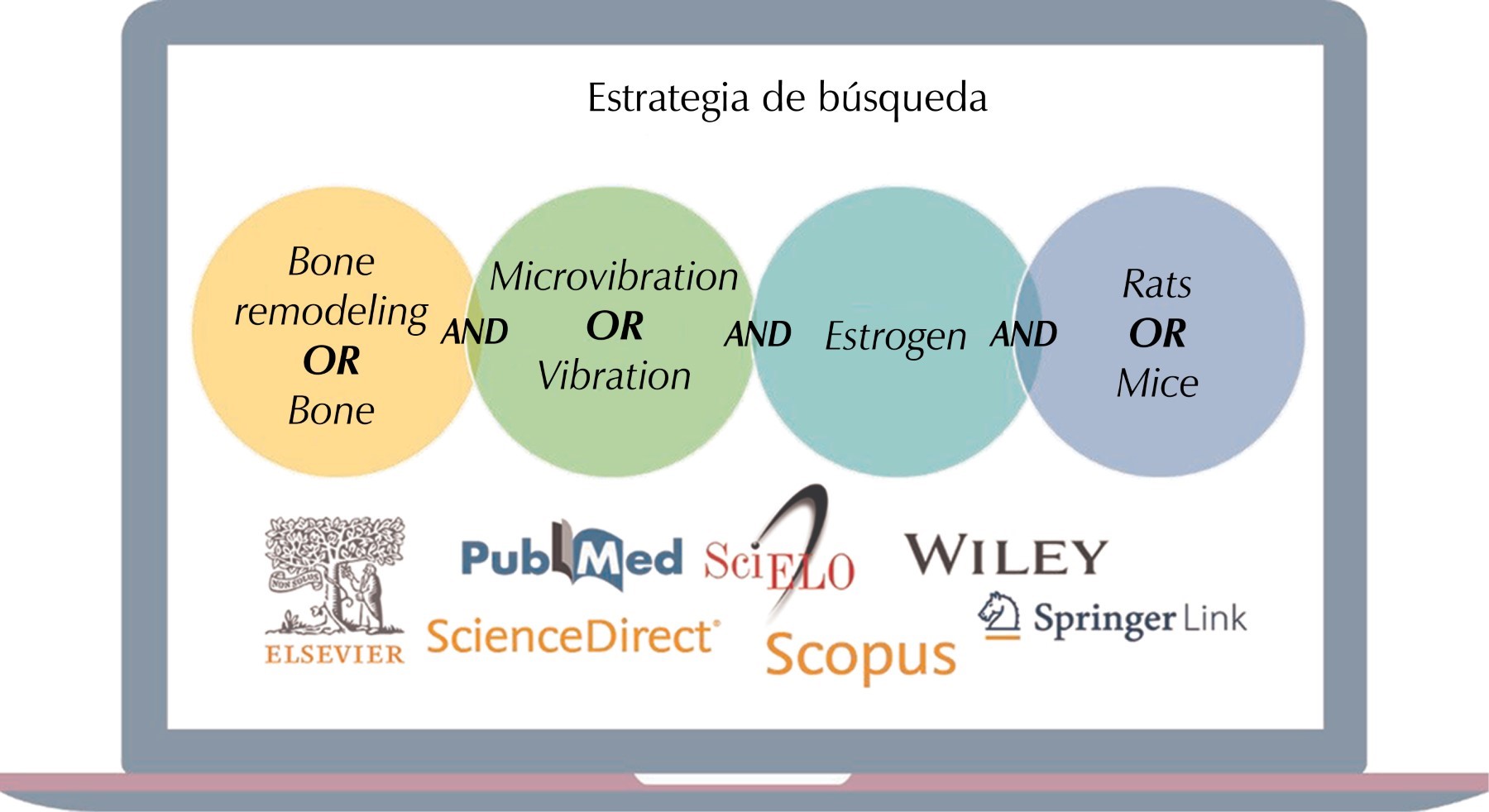 La búsqueda se realizó en siete bases de datos: Scopus, PudMed, Sciencedirect, ELSIEVER, Scielo, WILEY y Springer Link; con el empleo de la siguiente estrategia de búsqueda: Bone remodeling OR Bone AND microvibration OR vibration AND Estrogen AND rats OR mice (Figura 1). Se extrajeron los datos en formularios predefinidos realizados con Excel 2016, donde se recolectaron los datos de los artículos como: autor principal, tipo de estudio realizado, revista, país, año de publicación, etcétera.