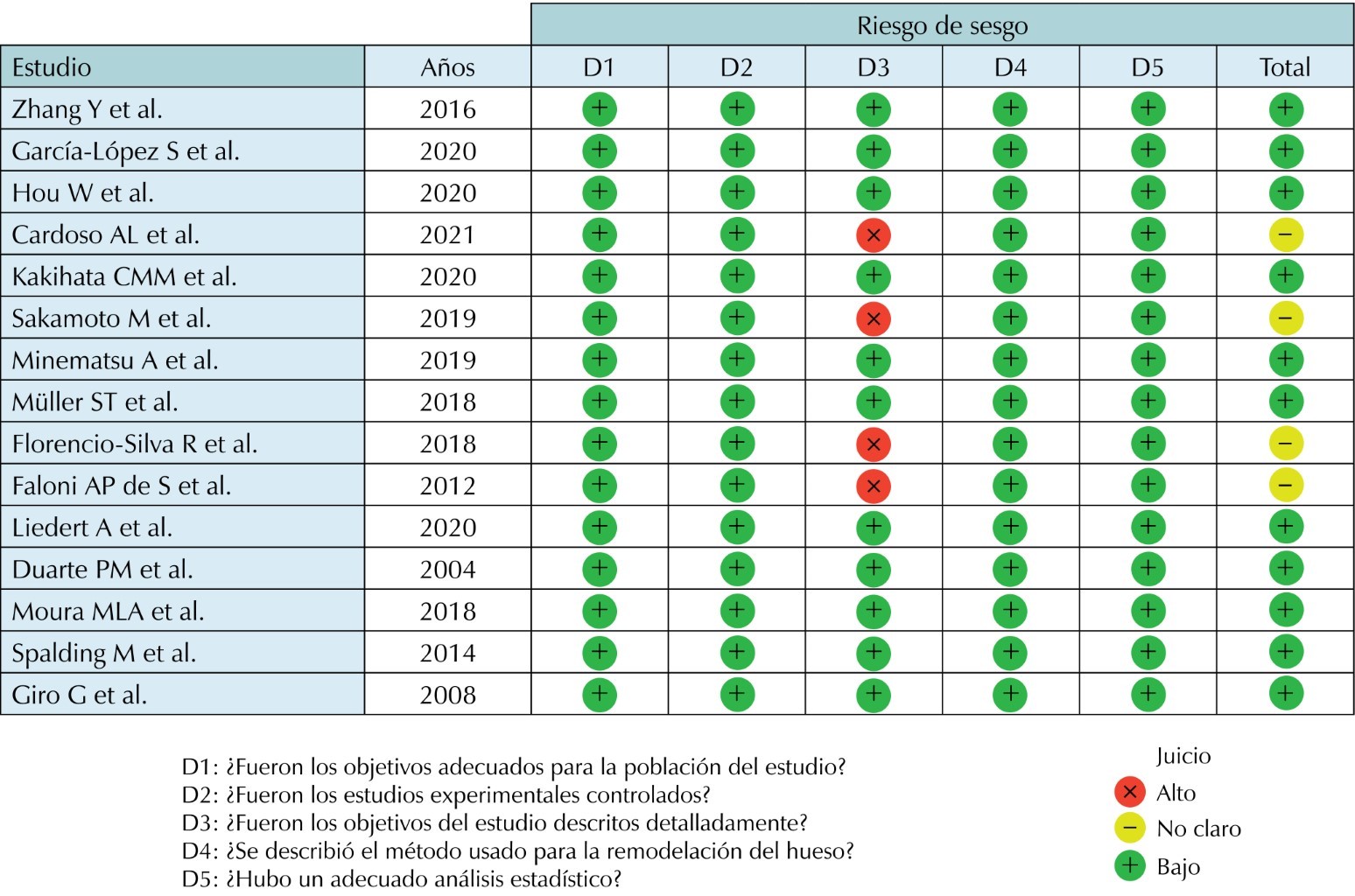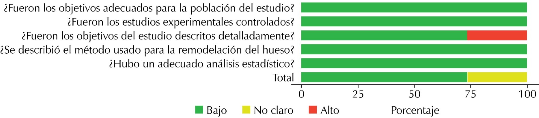 En la evaluación de calidad de los 15 estudios seleccionados con base en el método JADAD, se observa que los artículos seleccionados en esta revisión sistemática cuentan con una evaluación de mayor calidad, acorde a la suma de puntos que expresaron. En la evaluación del riesgo a sesgo de los artículos podemos observar que los artículos seleccionados presentan un bajo riesgo (Figuras 3 y 4).