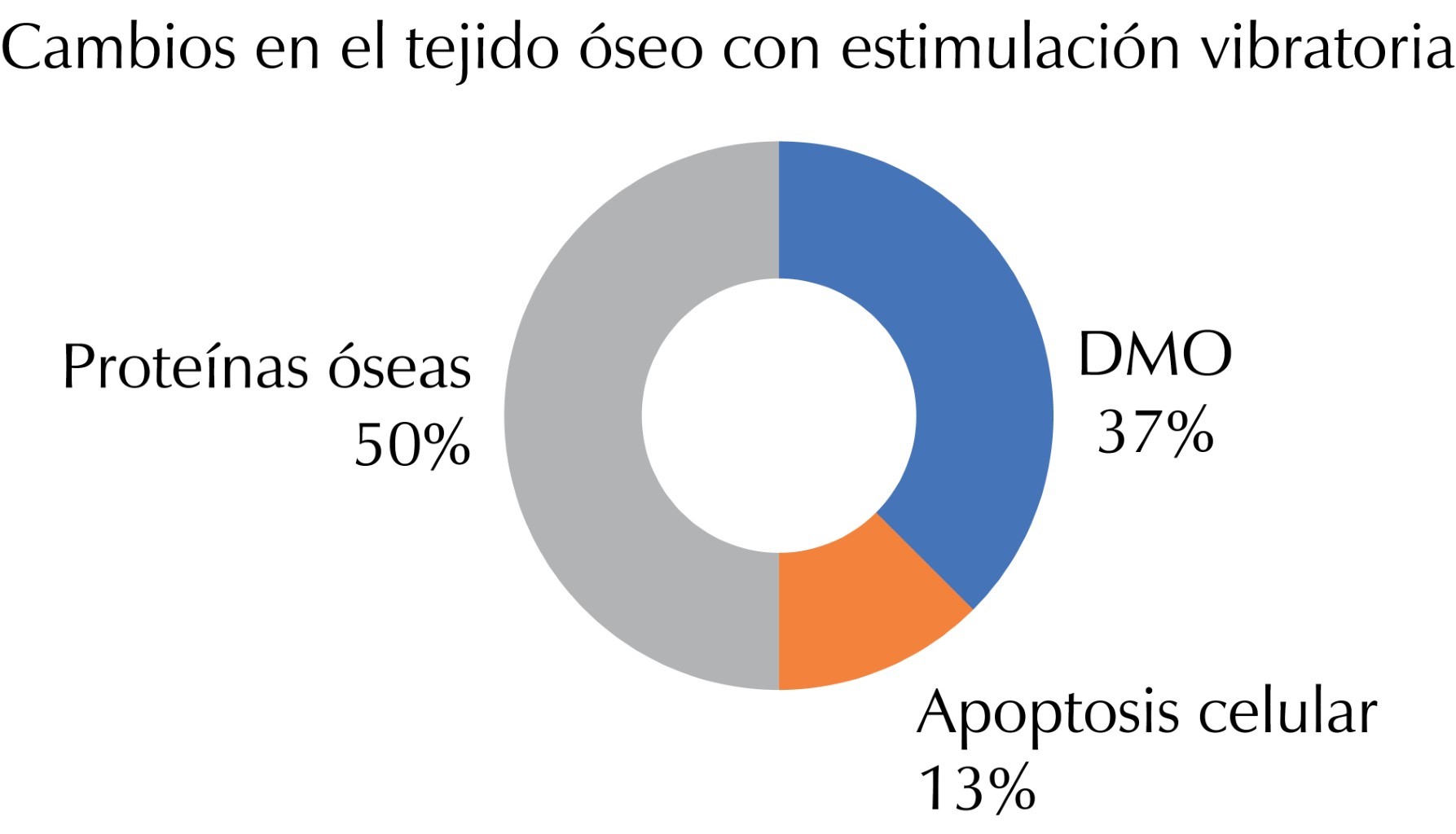 La vibración aplicada a células madre mesenquimales, a diferencia de los otros resultados, induce proliferación celular durante los primeros siete días al estimular la formación de cartílago entre algunos fragmentos del hueso; hecho verificado al obtener niveles aumentados de agrecano, Sox9 y BMP7 que representan marcadores específicos en este proceso, lo cual confirma la vibración como una herramienta alternativa para inducir la diferenciación condrogénica, células especializadas del tejido esquelético.20 Asimismo, está documentado que la vibración de cuerpo entero (WBV, por sus siglas en inglés) aumenta la masa ósea y mejora los parámetros estructurales en roedores jóvenes. En un estudio se aplicó este tipo de vibración in vivo, lo que aumentó la masa ósea trabecular, así como en los parámetros de la microestructura ósea trabecular. Este resultado nos indica que la microvibración indujo remodelación ósea, comprobado con los niveles séricos aumentados de la osteocalcina (marcador de la formación ósea), así como de la fosfatasa ácida-5b resistente al tartrato.21 Por otro lado, la WBV in vivo aumenta la densidad ósea, evaluación obtenida mediante escala de grises de las imágenes radiográficas que determinó un factor de aumento de densidad ósea (FIBD, por sus siglas en inglés). Estos resultados indican que, efectivamente, existe un aumento de la densidad ósea por el efecto osteogénico resultado de la estimulación vibratoria; sin embargo, dependen totalmente de la frecuencia del estímulo.22