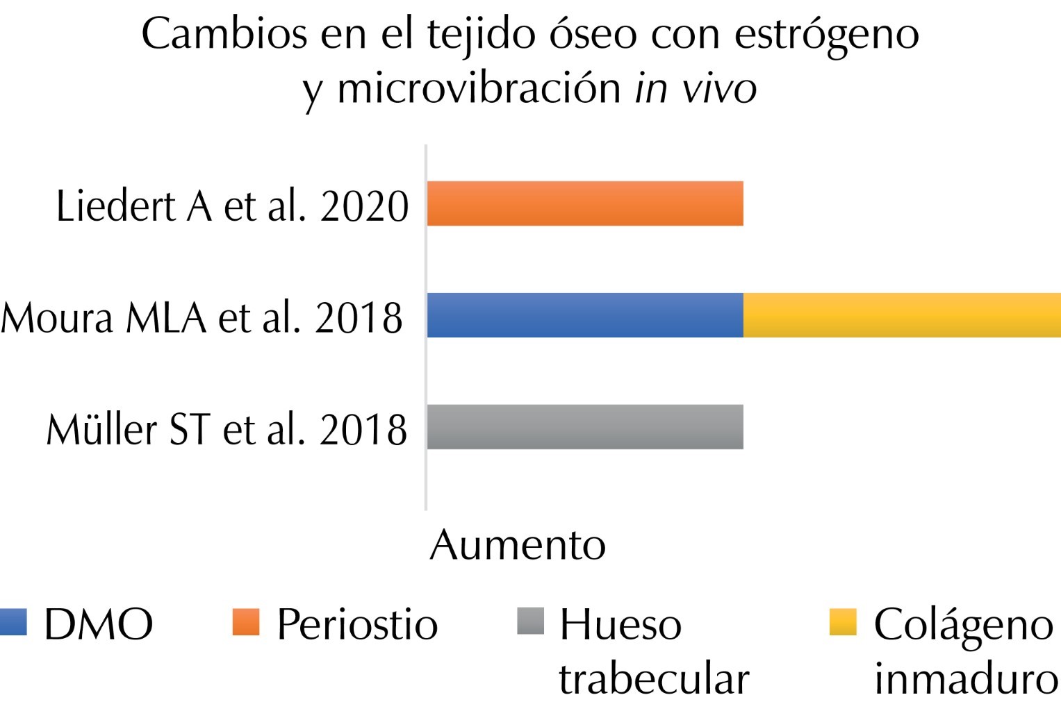 Como ha sido mencionado, la conservación del metabolismo óseo está relacionada con los niveles de estrógeno, aunque es importante mencionar que el ejercicio o la estimulación con vibración también ejercen un rol importante para el mantenimiento del tejido óseo; como en un estudio donde se colocó un tubo de silicona de 5 mm de largo con estradiol cristalizado en ratas Wistar. Un grupo de éstas tuvo acceso a ruedas para hacer ejercicio, mientras el grupo de control no lo tuvo. El grupo de estrógeno con acceso a ejercicio aumento 110% el grosor trabecular, en tanto que el grupo sin acceso sólo tuvo un efecto protector; con lo cual se concluyó que la administración de estrógeno tiene un alto impacto en la estimulación del movimiento. El grupo sin administración de estrógenos no presentó energía para la rueda, lo que demuestra, al igual que hicieron Spalding y colaboradores,29 que la intervención con estrógeno tiene mayor efecto o es más eficiente a corto plazo para poder prevenir la pérdida ósea, además de preservar la motivación general para realizar ejercicio.30 En otra investigación donde también se combinó la administración de 17β-estradiol con vibración de aceleración vertical, se reportaron bajos niveles en el porcentaje de grasa corporal en los grupos tratados con estrógenos y en el grupo de estrógenos más la vibración mecánica; esto se debe a que las señales mecánicas afectan los sistemas fisiológicos y son esenciales para lograr un sólido sistema musculoesquelético, así como para reducir la formación de tejido adiposo. Asimismo, se obtuvo un aumento en la DMO; sin embargo, la terapia hormonal en conjunto con la vibración tuvo mayor efecto para mejorar la microarquitectura y la densidad mineral ósea, ya que se encontró un mayor contenido de fibras de colágeno inmaduras, lo que refleja el estímulo de tejido óseo nuevo.31