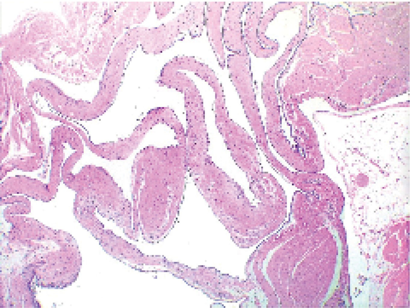Paciente femenino de 40 años de edad sin comorbilidades ni antecedentes quirúrgicos. Acudió al área de urgencias por la presencia de inguinodinia derecha, a la exploración física se identificó la presencia de una masa irreductible y fluctuante de 3 cm de diámetro aproximadamente. El ultrasonido inguinal reportó al inicio un defecto herniario de 14.6 mm y un saco herniario de 30 × 14 mm de contenido graso (Figura 1), mismo que no mostró vascularidad a la aplicación del modo Doppler color (Figura 2). Se programó para realización de hernioplastia inguinal derecha laparoscópica con técnica transabdominal preperitoneal. Durante el transoperatorio no se identificó defecto herniario (Figura 3), por lo que se realizó la exploración de toda la región inguinal derecha, identificando una lesión quística en el ligamento redondo que fue disecada y resecada en su totalidad (Figura 4), se colocó una malla preformada de polipropileno como en la plastia inguinal laparoscópica convencional. La paciente a las 24 horas posquirúrgicas inició vía oral y se egresó de manera satisfactoria. En el estudio histopatológico se reportó un quiste mesotelial multiloculado revestido por células mesoteliales compatible con quiste de Nuck, sin datos de neoplasia o malignidad (Figura 5).