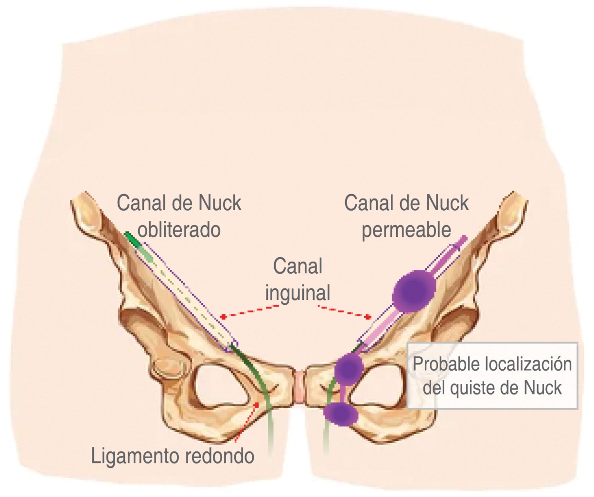 La obliteración del proceso vaginal procede gradualmente en una dirección de superior a inferior. En raras ocasiones, no se oblitera y el pliegue peritoneal persiste hasta la edad adulta, lo que puede provocar una hernia indirecta.3 Un canal de Nuck permeable permite que el líquido o el contenido pélvico se hernien a través del canal inguinal hacia los labios mayores. Si la porción inferior del canal de Nuck permanece permeable y la superior está obliterada, se desarrolla un quiste del canal de Nuck, también llamado hidrocele enquistado del canal de Nuck.1