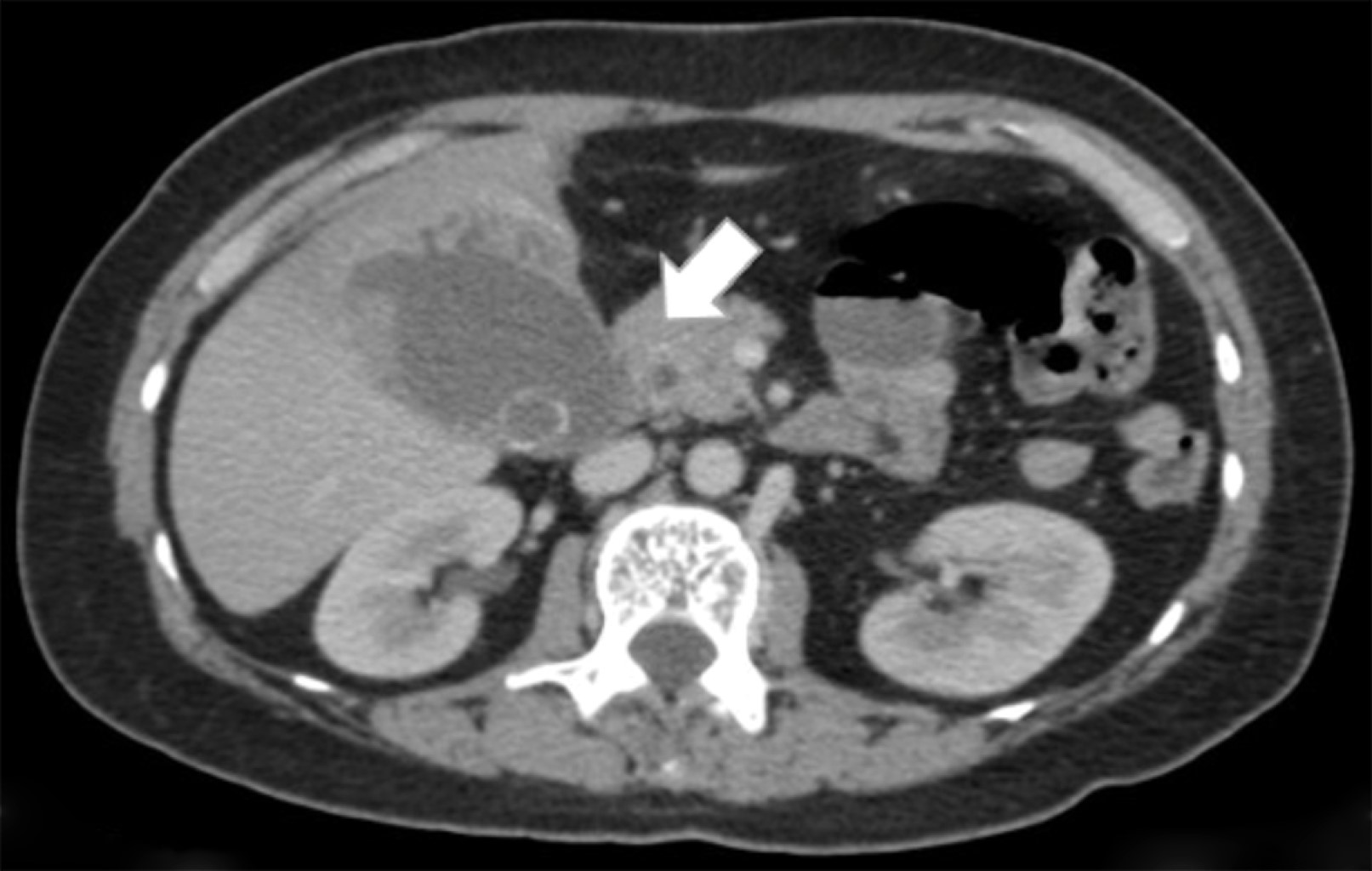 Se trata de paciente femenino de 55 años de edad quien acudió al servicio de urgencias con un cuadro de un mes de evolución caracterizado por dolor abdominal localizado en epigastrio e hipocondrio derecho, irradiado a región interescapular, mismo que fue aumentando, por lo que decidió acudir con facultativo quien inició manejo homeopático; sin embargo, no presentó mejoría, por lo que acudió al servicio de urgencias de nuestra unidad hospitalaria donde se registraron los siguientes signos vitales: TA (tensión arterial) 114/76 mmHg, Fc (frecuencia cardiaca) 124 lpm, Fr (frecuencia respiratoria) 16 rpm, temperatura 36 oC. Al interrogatorio la paciente negó la presencia de fiebre, náusea, vómito o presencia de evacuaciones disminuidas en consistencia. Para su abordaje se solicitaron laboratorios generales, de los cuales destacan la presencia de leucocitosis (12,300 mm3), elevación de fosfatasa alcalina y GGT (315 y 268 U/l respectivamente); se solicitó una tomografía computarizada de abdomen con contraste intravenoso (Figuras 1, 2 y 3) que evidenció la presencia de vesícula biliar con litos en su interior, impactados y ruptura intrahepática, además de un absceso intrahepático en segmentos IV y V (Figura 2).