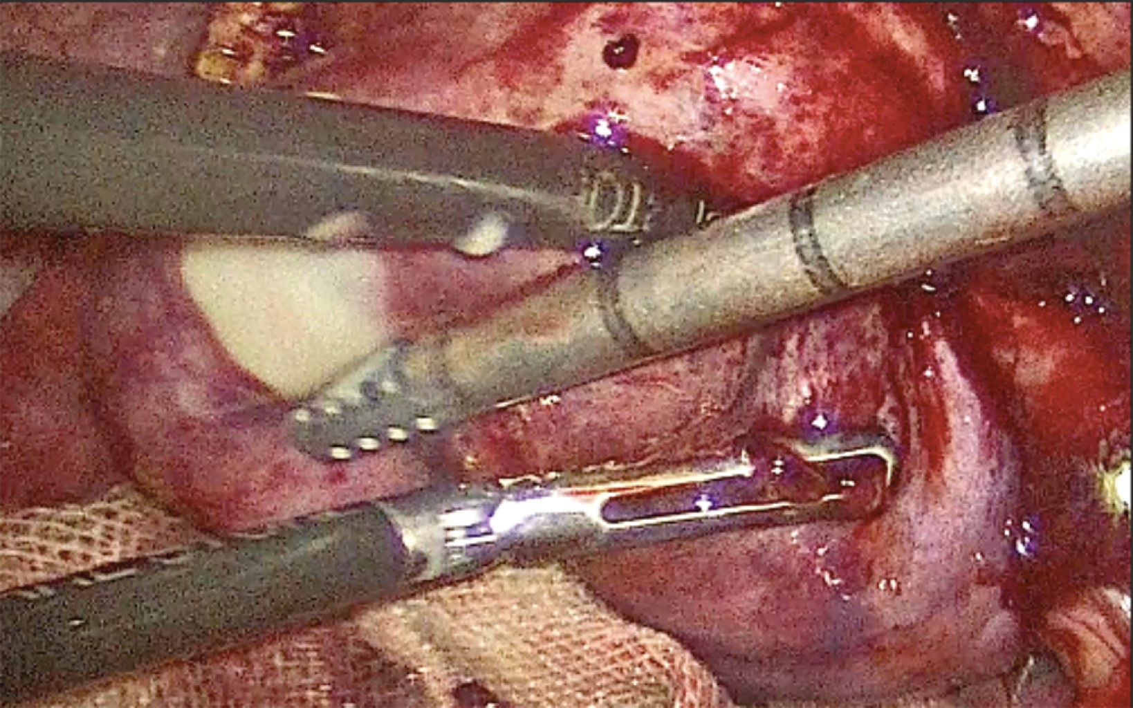 Se inició antibioticoterapia a base de carbapenémico e imidazol con posterior manejo quirúrgico. Se realizó colecistectomía más drenaje de absceso y colocación de drenajes por laparoscopia. Se colocaron cuatro trocares, en región umbilical y subxifoidea de 12 mm, en hipocondrio y flanco derecho de 5 mm, encontramos una vesicular biliar cubierta en su totalidad por epiplón correspondiente a Parkland 5 (Figura 4) con paredes adematosas y un absceso hepático en segmentos IV y V adherido a pared abdominal. Se drenaron aproximadamente 200 cm3 de material purulento (piocolecisto y absceso) (Figura 5), mismos que se mandaron a cultivar con reporte de crecimiento de Streptococcus anginosus y Enterobacter cloacae, se extrajo pieza con bolsa extractora y finalmente se colocaron drenajes cerrados de tipo Blake de 19 Fr a hiato de Winslow y a la cavidad del absceso, la paciente fue egresada a domicilio al cuarto día postoperatorio, se ajustó esquema antimicrobiano al egreso con ampicilina/sulbactam y metronidazol hasta completar 14 días totales de antibioticoterapia; en la consulta de seguimiento, al séptimo día postquirúrgico, la paciente se encontraba sin dolor en sitio quirúrgico, afebril, con buena tolerancia a la vía oral, con excretas al corriente. Se decide retirar ambos drenajes.