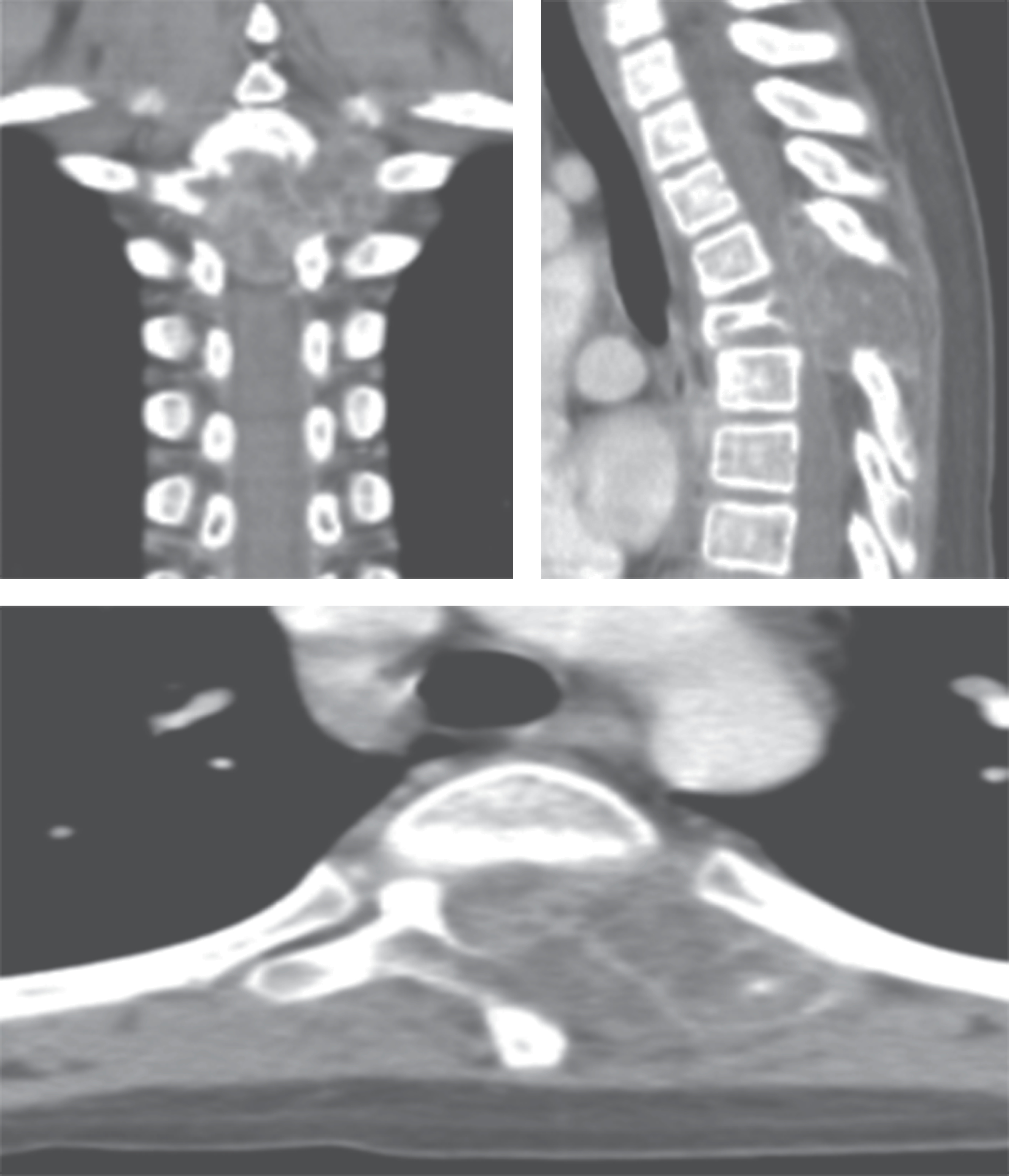 Evaluación de estudios de imagen: en la tomografía realizada inicialmente se observa en corte sagital pérdida de la curvatura normal de la columna con presencia de colapso vertebral a nivel de T4 con lesión tumoral de patrón geográfico (Figura 1), lobulada, que compromete apófisis espinosa. En el corte axial se observa compromiso del cuerpo vertebral, pedículo, lámina y unión costovertebral izquierda con invasión al conducto medular, lo cual explicaría la paresia de miembros inferiores y alteraciones de la marcha que presentaba el paciente.