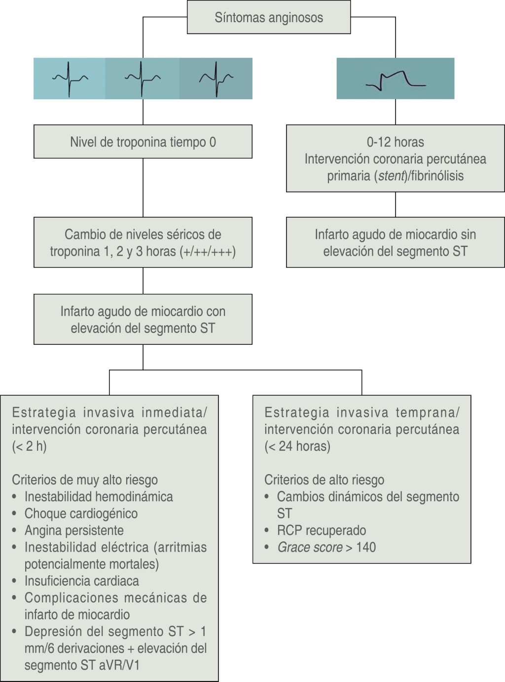 En el caso de infarto agudo de miocardio con elevación del segmento ST (IAMCEST) se tienen en consideración las manifestaciones electrocardiográficas que indican isquemia miocárdica aguda en ausencia de hipertrofia del ventrículo izquierdo (HVI) y bloqueo de rama izquierda del haz de His (BRIHH), que consisten en elevación del segmento ST en el punto J en dos derivaciones contiguas ≥ 1 mm en todas las derivaciones excepto V2-V3, a las que se aplican los siguientes puntos de corte: ≥ 2 mm para varones de edad ≥ 40 años; ≥ 2.5 mm para varones < 40 años, y ≥ 1.5 mm para las mujeres de forma independiente a su edad. En el caso de depresión del segmento ST y cambios en la onda T, éstos consisten en depresión horizontal o descendente ≥ 0.5 mm en dos derivaciones contiguas o inversión de la onda T > 1 mm en dos derivaciones contiguas con onda R prominente o cociente R/S > 1.50,51