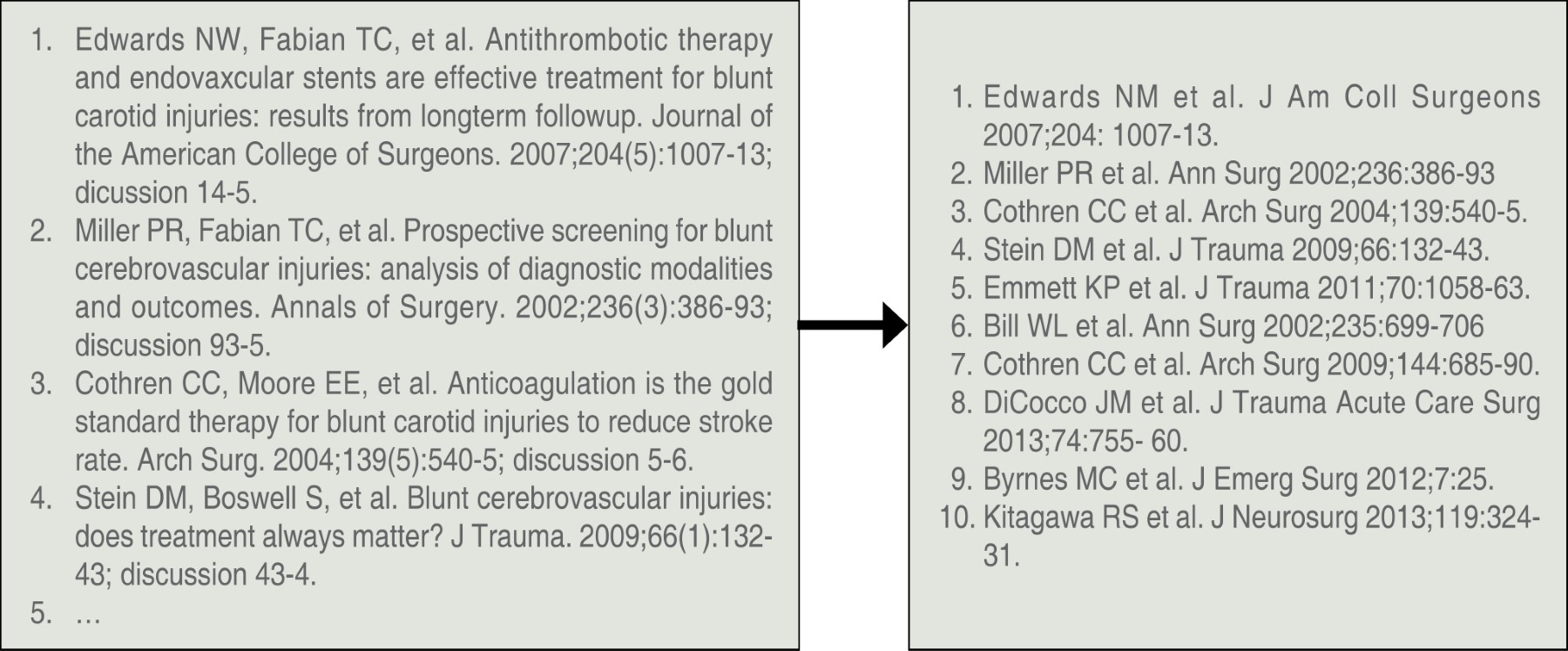 Las citas bibliográficas o referencias deberán reducirse al mínimo y estar abreviadas, no es necesario seguir el formato tradicional de un artículo científico, siempre cite números en el texto y sólo limítese a las referencias relevantes, utilice el siguiente formato: primer autor et al, sin título de la publicación y de preferencia usando el formato Vancouver (Figura 2).