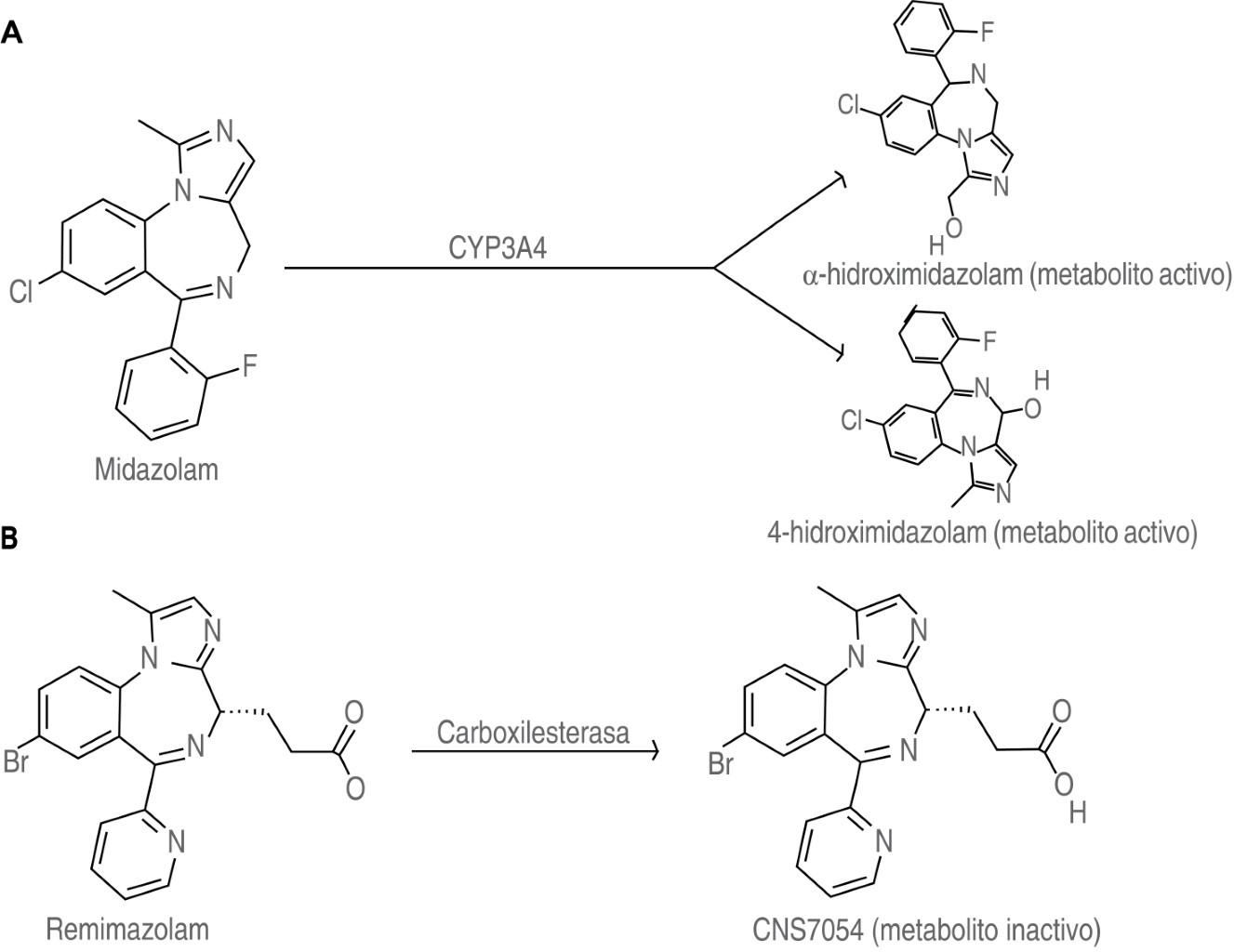 El remimazolam es una nueva benzodiacepina para uso intravenoso, desarrollada como un agente de acción ultracorta para procedimientos que requieren de sedación, así como para la inducción y mantenimiento de la anestesia. También recomendado para sedación en la unidad de terapia intensiva. El remimazolam es un medicamento basado en un enlace éster que es rápidamente hidrolizado en el cuerpo a metabolitos inactivos(2,3) (Figura 1). Tiene una alta afinidad por el receptor ácido γ-aminobutírico A (GABA A)(4,5).
