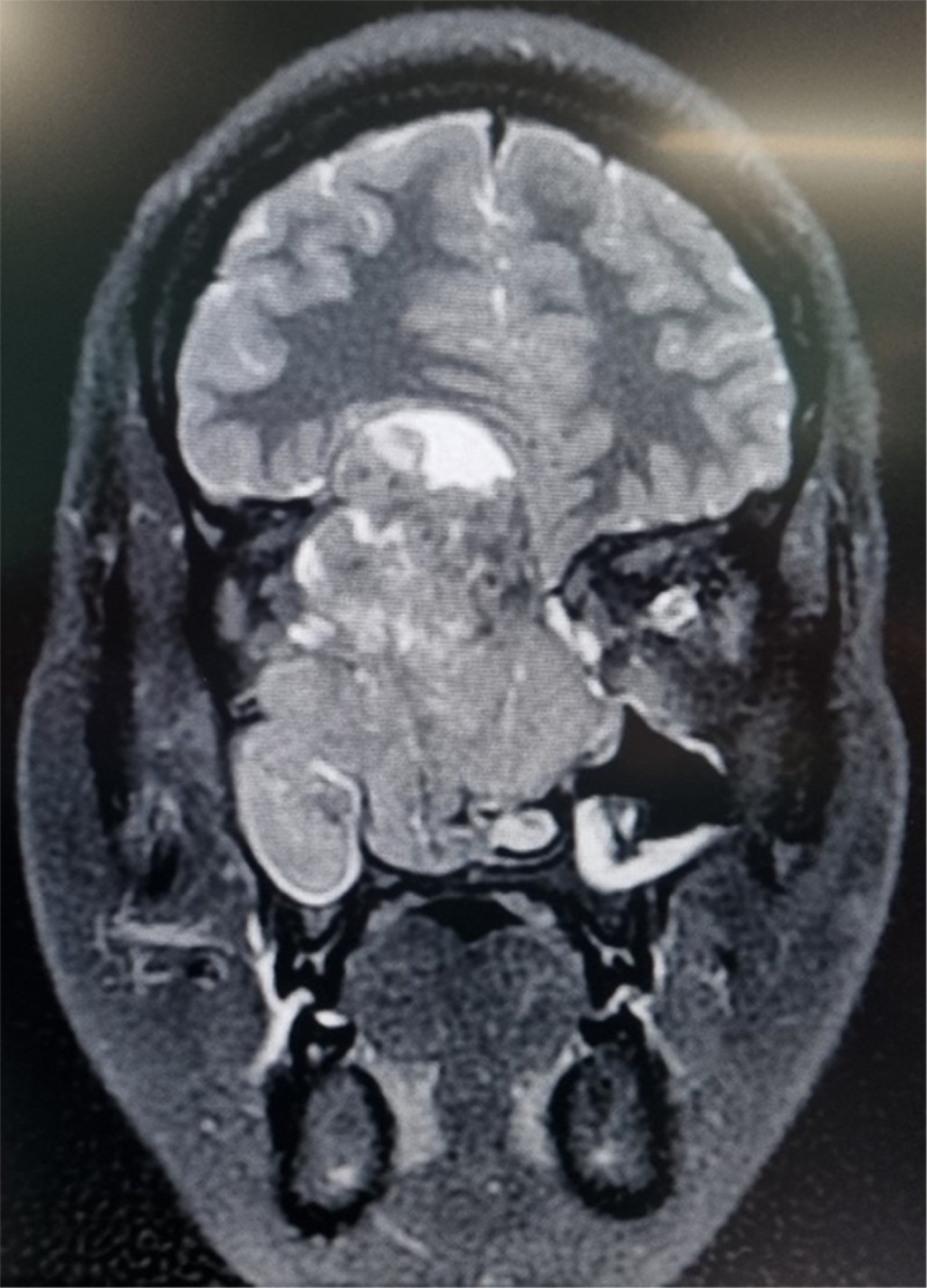 En la exploración neurológica tuvo Glasgow de 15 puntos, funciones mentales íntegras, alteración de nervios craneales, el I y II presentó anosmia total y amaurosis de ojo derecho, nervios craneales III, IV, VI con pupila derecha de 4 mm arrefléctica, reflejo consensual conservado bilateral, mirada primaria con estrabismo divergente a expensas de deformidad orbitaria derecha con movimientos oculares conjugados, nervio craneal V con ageusia, y VII con asimetría facial a expensas de tumoración orbitaria derecha; el resto de nervios craneales y la exploración física se encontró sin alteraciones.