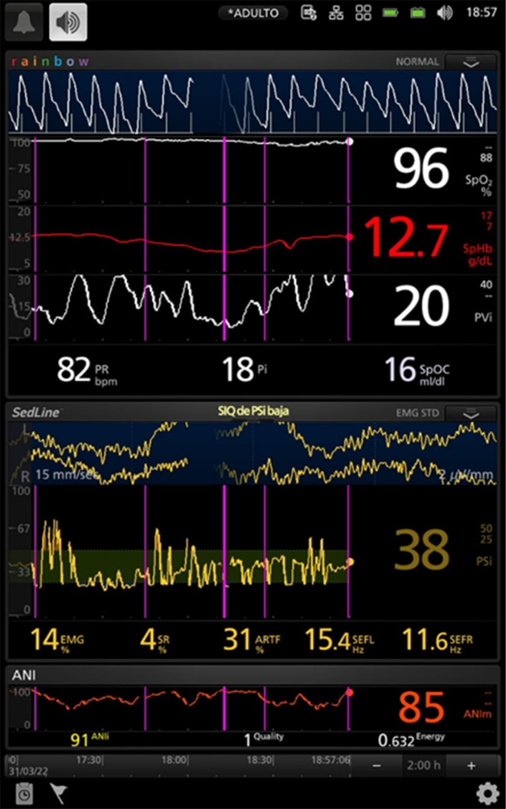 En nuestro caso, el PSI (medido por el monitor SEDLine) utiliza cuatro electrodos distintos más un electrodo de tierra y de referencia adicional, esto permite que se incorpore información de varias regiones del cerebro para reflejar simultáneamente los cambios globales y regionales de su estado(10). Por otra parte, el uso de la línea arterial, la monitorización del gasto cardíaco no invasivo para la vigilancia de la hemodinamia y el empleo oportuno de vasopresores permitirán guiar una reanimación de calidad para evitar desenlaces desfavorables en el postoperatorio.