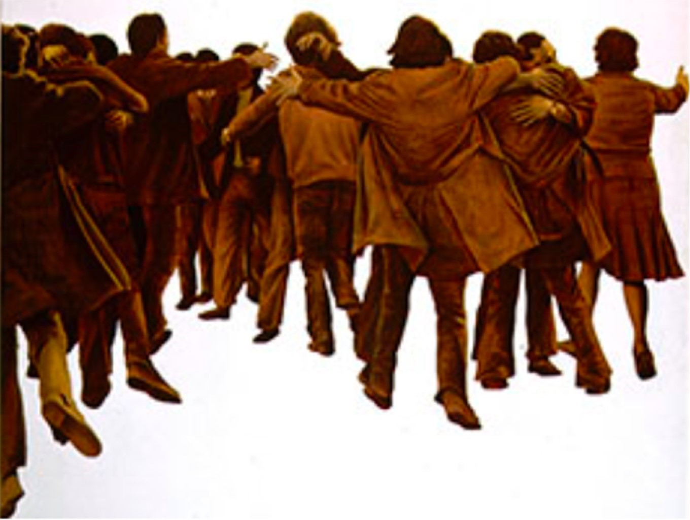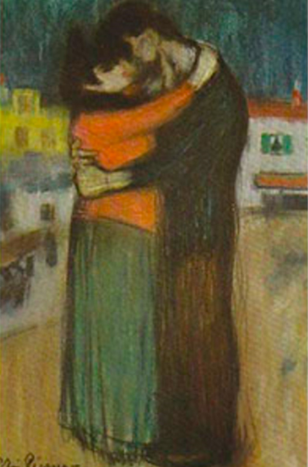 Gustav Klimt (1862-1918) fue un pintor austriaco, su obra más conocida es El beso, que se caracteriza por su especial colorido. El beso es el protagonista principal, pero no es un beso solitario y frío, es un beso cálido, íntimo, amoroso, pasional, en el que el abrazo es su fiel compañero (Figura 1). Pablo Picasso (1881-1973), el famoso pintor catalán, plasma en una pintura al pastel sobre papel otro abrazo, sencillo, público, austero, con un fondo urbano (Figura 2). Juan Genovés (1930-2020) plasmó en su obra pictórica la transición política española en su obra Abrazos, pintura en color sepia, en la que personajes en el anonimato facial se abrazan, un abrazo colectivo y festivo que refleja el triunfo de la democracia (Figura 3).