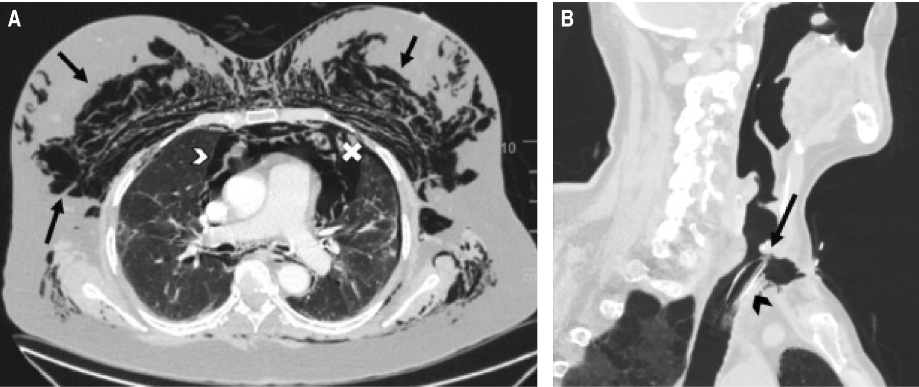 A las 72 horas de la intervención se observó un abundante enfisema subcutáneo cervicofacial. Se llevó a cabo una tomografía computarizada (TC) que describía el enfisema subcutáneo, neumomediastino con compresión traqueal, así como un pequeño neumotórax izquierdo (Figura 1A). A pesar de que en la TC no se evidenciaba una rotura traqueal, se hizo una fibrobroncoscopía que mostró una solución de continuidad de 2 centímetros en la pars membranosa, a nivel de la carina. Ante la estabilidad clínica de la paciente, la ausencia de progresión del enfisema subcutáneo y al tener en cuenta los antecedentes recientes, se decidió llevar a cabo un manejo conservador administrando piperacilina-tazobactam, con lo cual hubo una franca mejoría en los tres días posteriores, lo que permitió el alta a la planta de hospitalización.