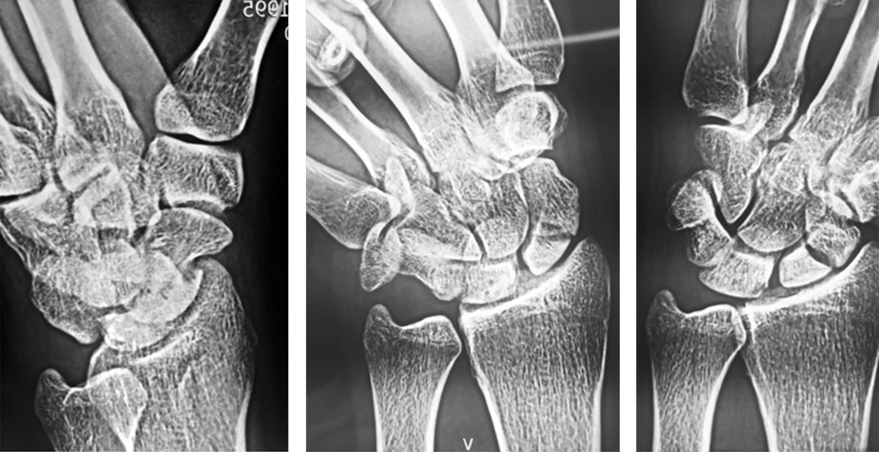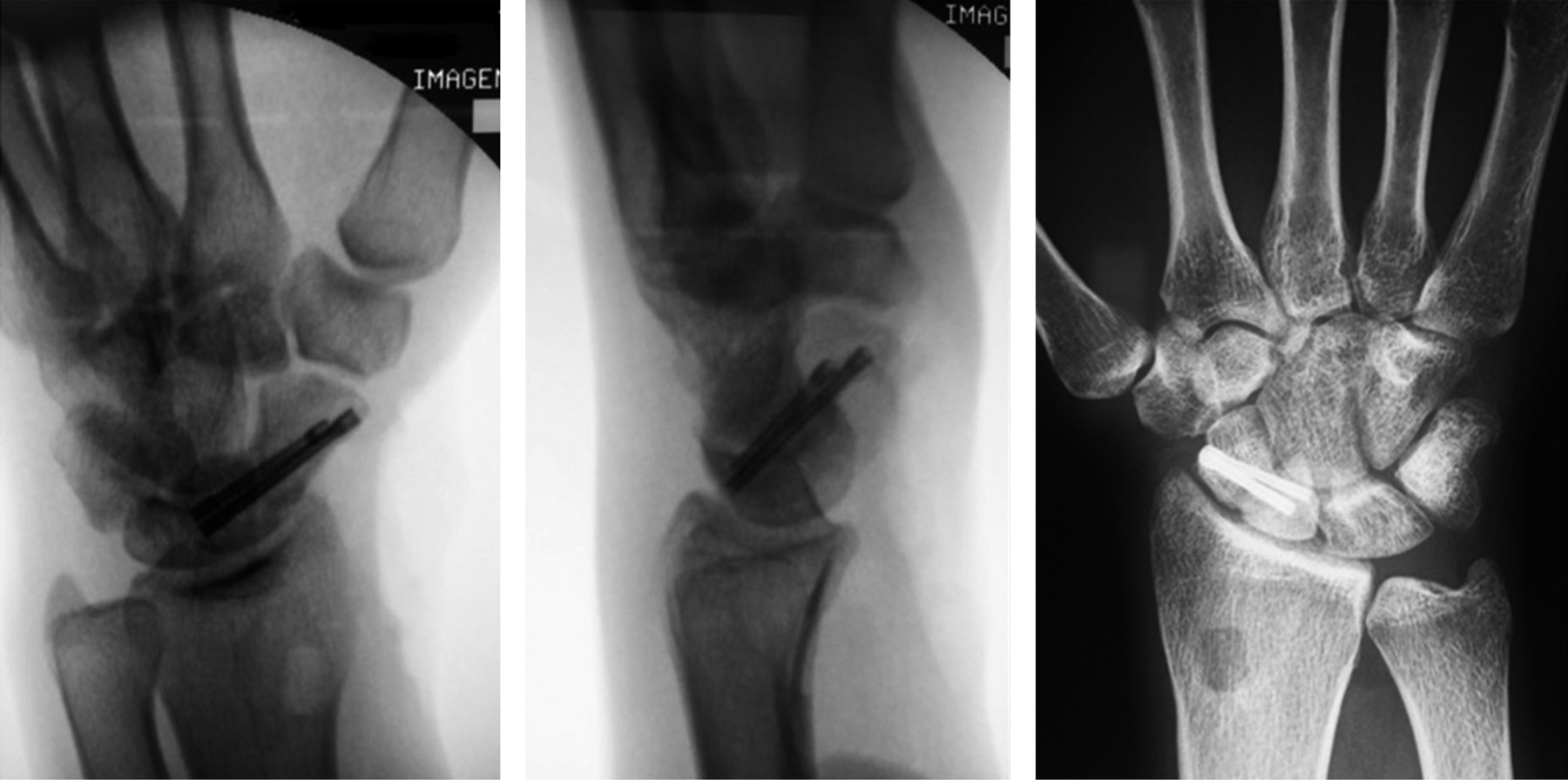 Se corrigió la deformidad en joroba del escafoides que mostraban los dos pacientes y se corrigió la inestabilidad dorsal del segmento intercalado en dos de los tres pacientes que lo presentaban (Figura 4).