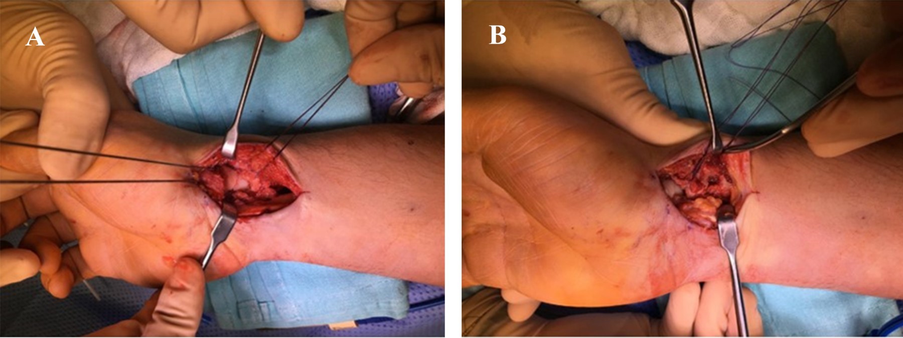 Se suturó cápsula articular, ligamento radioescafogrande, vientre muscular y fascia de pronador cuadrado con vicryl (Ethicon) del número 2 utilizando puntos en "X" y tejido celular subcutáneo y piel con MONOCRYL (Ethicon) 4-0 con puntos invertidos y subdérmicos respectivamente. Se cubrió la herida con gasas y férula antebraquiopalmar.