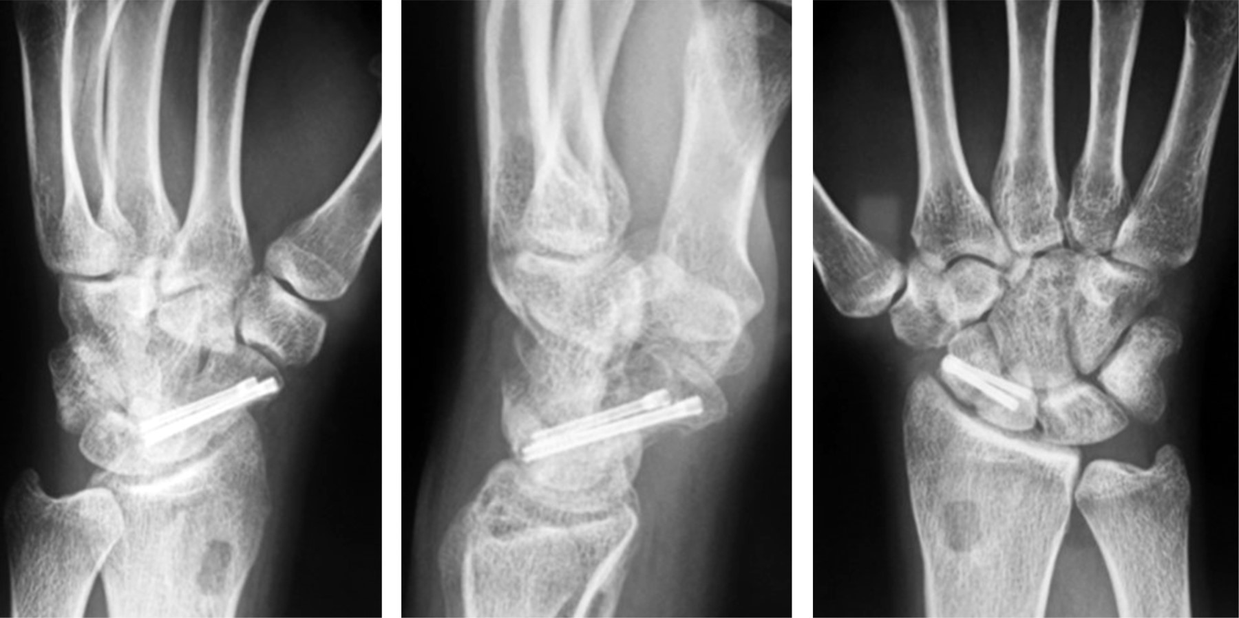 El protocolo postoperatorio fue el mismo en los cuatro pacientes con el uso de férula antebraquiopalmar no removible durante dos semanas progresando al uso de muñequera removible. Al momento que se retiró la férula antebraquiopalmar iniciaron fisioterapia con movimientos pasivos y activos de codo, muñeca, articulaciones interfalángicas y metacarpofalángicas, restringiendo cargar objetos pesados. Una vez que resolvió la sintomatología clínica se retiró el uso de inmovilización y se tomaron radiografías de control, las cuales definieron consolidación radiográfica la presencia de puentes óseos trabeculares entre los fragmentos en tres proyecciones distintas.