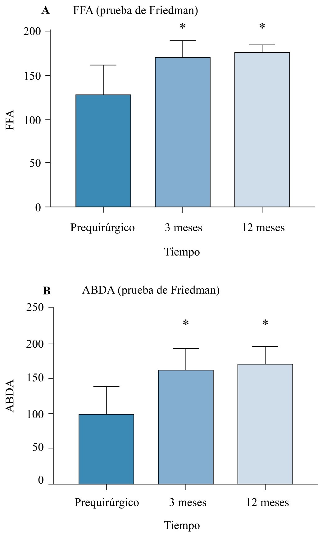Análisis estadístico. Se realizó una estadística descriptiva para contrastar las características de los pacientes. Los datos se presentaron en medidas de tendencia central media y desviación estándar. Para el análisis estadístico se recurrió a la prueba de normalidad de Kolmogórov-Smirnov, con el fin de conocer la distribución de los datos. Se empleó el test de Friedman para muestras repetidas y para las variables de movimiento. Los resultados arrojan una estadística significativa cuando p ≤ 0.05. Se aplicó el Graph Pad Prisma versión 7 para el análisis estadístico.