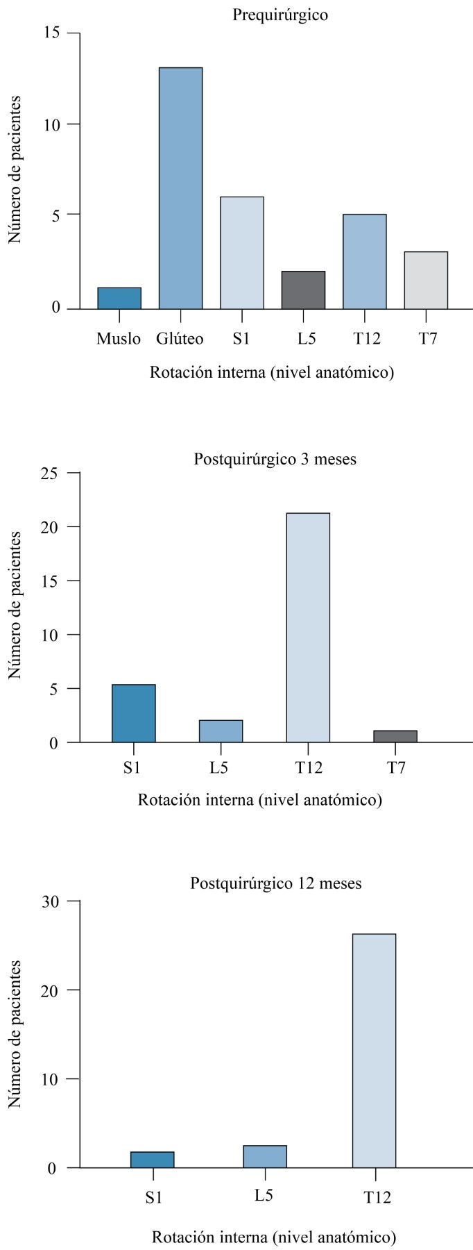 Se evaluó el nivel de rotación interna de los pacientes previa y posteriormente a la intervención quirúrgica. Así, la Figura 2 reporta los niveles de rotación interna de los pacientes precirugía y postcirugía (tres y 12 meses). Dependiendo del sitio de rotación interna, se le otorgó un puntaje basado en la Constant Score y se realizó la prueba de Friedman para muestras repetidas para la variable de rotación interna.