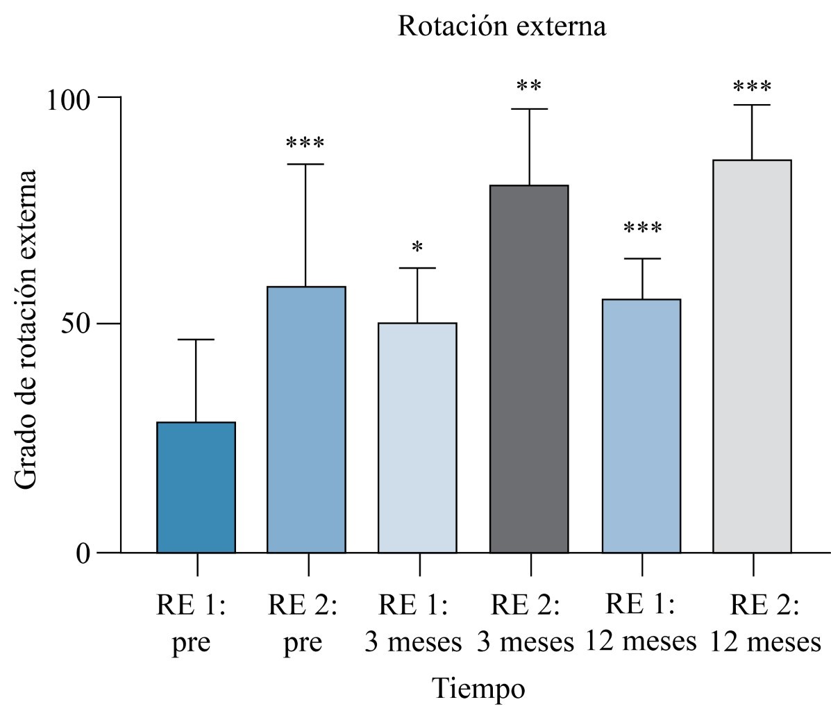 El valor del ángulo de rotación externa se evaluó en rotación externa 1 (RE 1: codo al lado y en contacto con el tórax y a 90o de flexión); y rotación externa 2 (RE 2: codo a 90o de abducción y 90o de flexión) prequirúrgico y posteriormente a tres y 12 meses del tratamiento quirúrgico. Los resultados se presentan en la Tabla 3 y la evolución comparativa en la Figura 3.