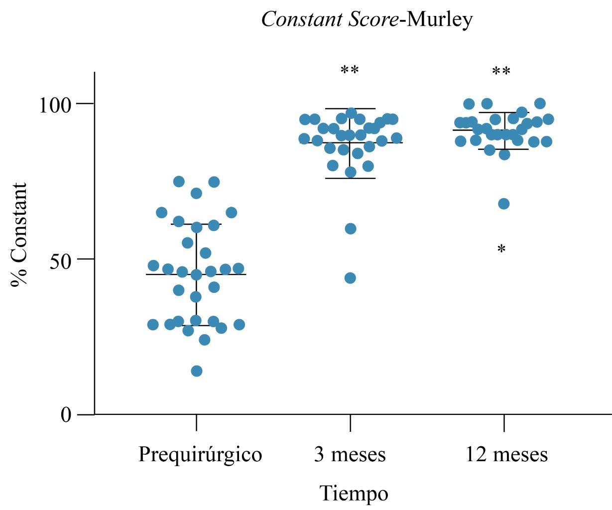 En las comparaciones de la Constant Score en los diferentes tiempos de monitoreo se observan diferencias significativas entre los tres meses: 87.27 ± 10.94; y los 12 meses: 91.30 ± 6.00. Lo anterior en comparación con el valor inicial antes de la cirugía 45.76 ± 16.35 con un valor de p < 0.0001 (Figura 4). En el test de Friedman para muestras repetidas también se advierten diferencias significativas entre los tiempos postquirúrgicos en comparación con el valor basal: p < 0.0001, a propósito, se observan diferencias significativas entre los tiempos postquirúrgicos en comparación con el valor prequirúrgico: p < 0.0001 y los tres meses contra los 12 meses: p = 0.02.