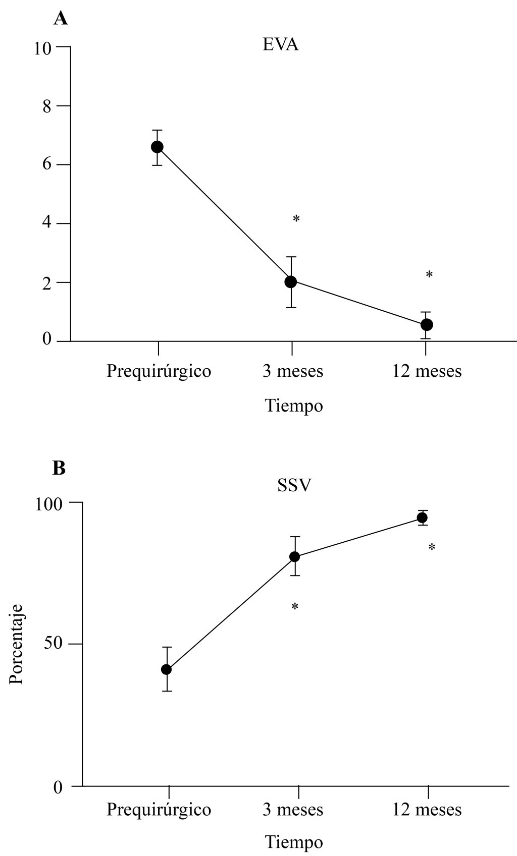 En relación con el análisis de la escala SSV y de manera prequirúrgica, los rangos iniciales oscilaron entre 10 y 80%, con media de 41.3% ± 20.89. Después del procedimiento se reportaron valores en la escala SSV con rango de 20 a 100%. A los tres meses la media fue de 81.43% ± 18.31 y a los 12 meses de 94.37% ± 6.90 con una p = 0.0001 (Tabla 4) y con la escala EVA, la media inicial fue 6.6 ± 1.6, a los tres meses de 2.0 ± 2.4 y a 12 meses de 0.63 ± 1.02, p < 0.0001 (Tabla 5). En estas escalas se observa una mejoría significativa en la escala del dolor y SSV, en comparación con el inicio (Figura 5).