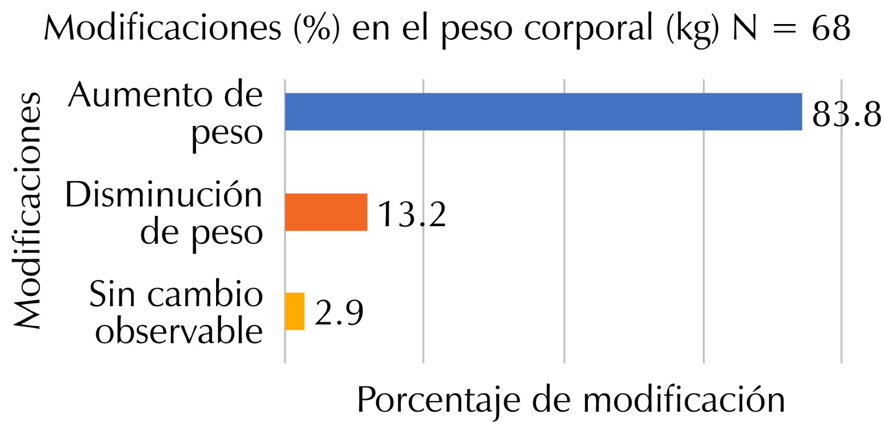 Los resultados obtenidos en este estudio revelan que la pandemia por COVID-19 y sus implicaciones tuvieron un efecto indeseable en la mayoría de los pacientes evaluados en la COyENT, aumentando el peso en 83.8% de la población estudiada. En coincidencia con el tiempo de estudio de esta investigación el Instituto Nacional de Salud Pública de México llevó a cabo la Encuesta de Salud y Nutrición en niñas y niños menores de 12 años durante la pandemia por COVID-19 (ENSARS-CoV-2) en el mes de septiembre y octubre de 2020, realizada en una población de 3,007 madres, padres o cuidadores que tuvieran niñas o niños menores de 12 años. Se reportó que 47% de los padres o madres de niñas y niños de dos a 11 años habían percibido aumento de peso en los menores durante la pandemia.7 En otro estudio realizado en población abierta con adultos polacos durante la cuarentena se reporta que cerca de 30% experimentó un aumento de peso, siendo con mayor frecuencia en los sujetos con sobrepeso y obesidad.8