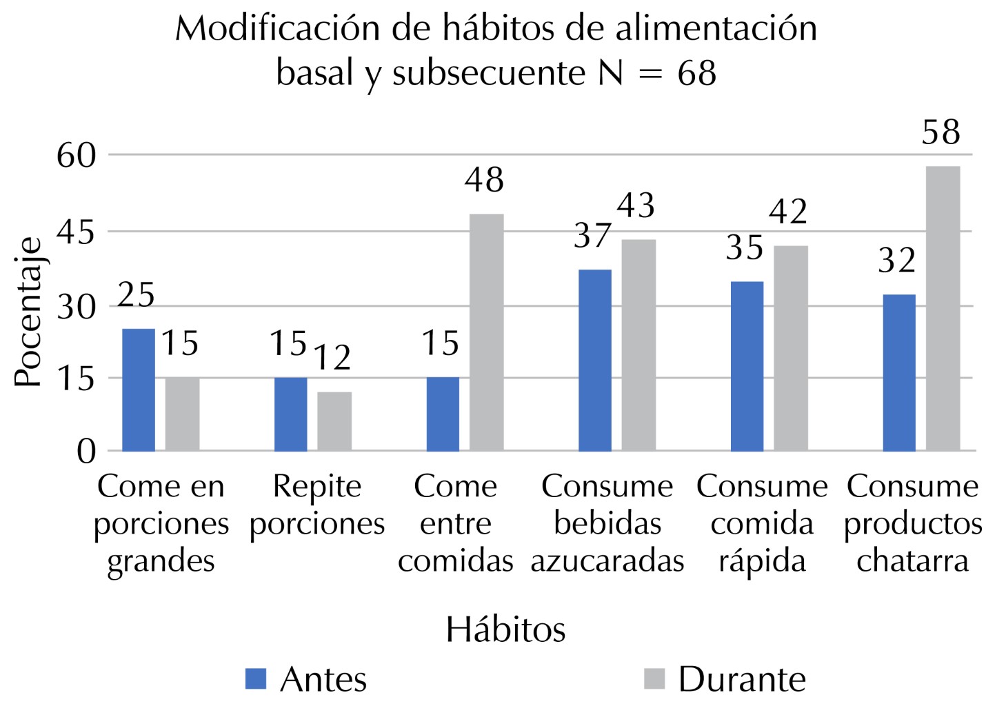 Los resultados de la encuesta sobre los hábitos de alimentación, antes y durante el confinamiento por COVID-19 mostraron datos alarmantes de los pacientes de la COyENT como el aumento de consumo de alimentos hiperenergéticos conocidos coloquialmente como productos chatarra. En semejanza, los resultados en el país que son reportados por la ENSARS-CoV-2 describen que más de 70% de la población estudiada consumió grupos de alimentos no recomendables como grasas saturadas, azúcares añadidos, bebidas azucaradas y botanas, dulces y postres. De los niños y niñas de edad escolar, 90% consumieron alimentos con azúcares añadidos durante cuatro días a la semana. Entre 13 y 17% de los niños consumen un vaso (250 ml) o más de refresco en un día promedio y cerca de 50% consumen poco menos de un vaso.7 Mismo fenómeno fue observado por Sidor y Rymski en el que más de 43.0% y casi 52% informaron en mayor cantidad y picar más alimentos, respectivamente. Asimismo, estas tendencias fueron más frecuentes en personas con sobrepeso y obesidad.8 Un estudio similar realizado por diversos investigadores de Europa, África, Asia y América lanzaron una encuesta internacional en línea en siete idiomas para observar las consecuencias del comportamiento y estilo de vida de las restricciones de COVID-19. Encontraron que debido a la actual situación se observa un efecto negativo en todos los niveles de intensidad de actividad física, el tiempo que pasan sentados aumentó de cinco a ocho horas por día. Otra modificación importante registrada fueron los tiempos de comida, los cuales antes del confinamiento realizaban de cuatro a cinco comidas diarias y esto aumentó en 10% durante el confinamiento, y la población que consumía más de cinco tiempos se triplicó.