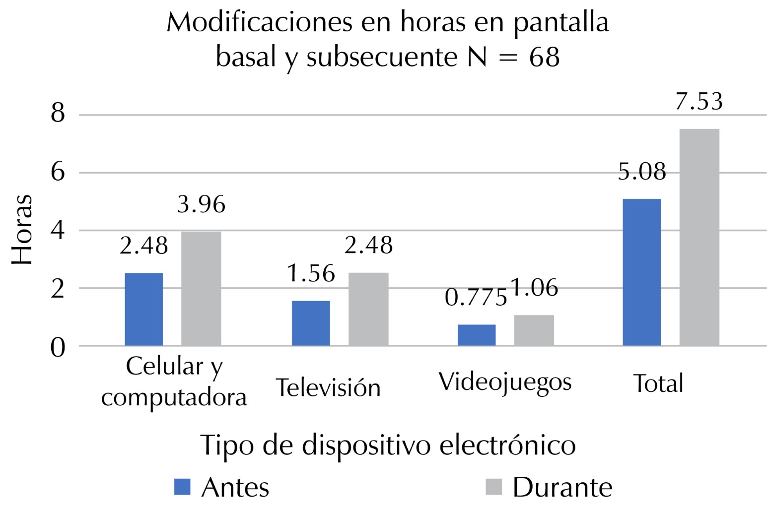Otro dato relevante de nuestro estudio fue el aumento de tiempo no académico frente a pantallas, el cual incrementó de cinco horas ocho minutos (valor promedio en la población) a siete horas 53 minutos, lo que significa dos horas 45 minutos más por día equivalente a 44.83% más de tiempo destinado a este hábito. Al respecto algunos autores han descrito que el tiempo que los niños dedican frente a pantalla como medio de entretenimiento durante la pandemia por COVID-19 es de más de cuatro horas al día (en niños de dos a cuatro años en 8%, de cinco a siete años 9.9% y de ocho a 11 años 17.3%). Este estudio reveló que COVID-19 tuvo un efecto negativo en la actividad física (disminución de la actividad física y aumento del tiempo de pantalla en 43 y 44.8% de los encuestados, respectivamente).7