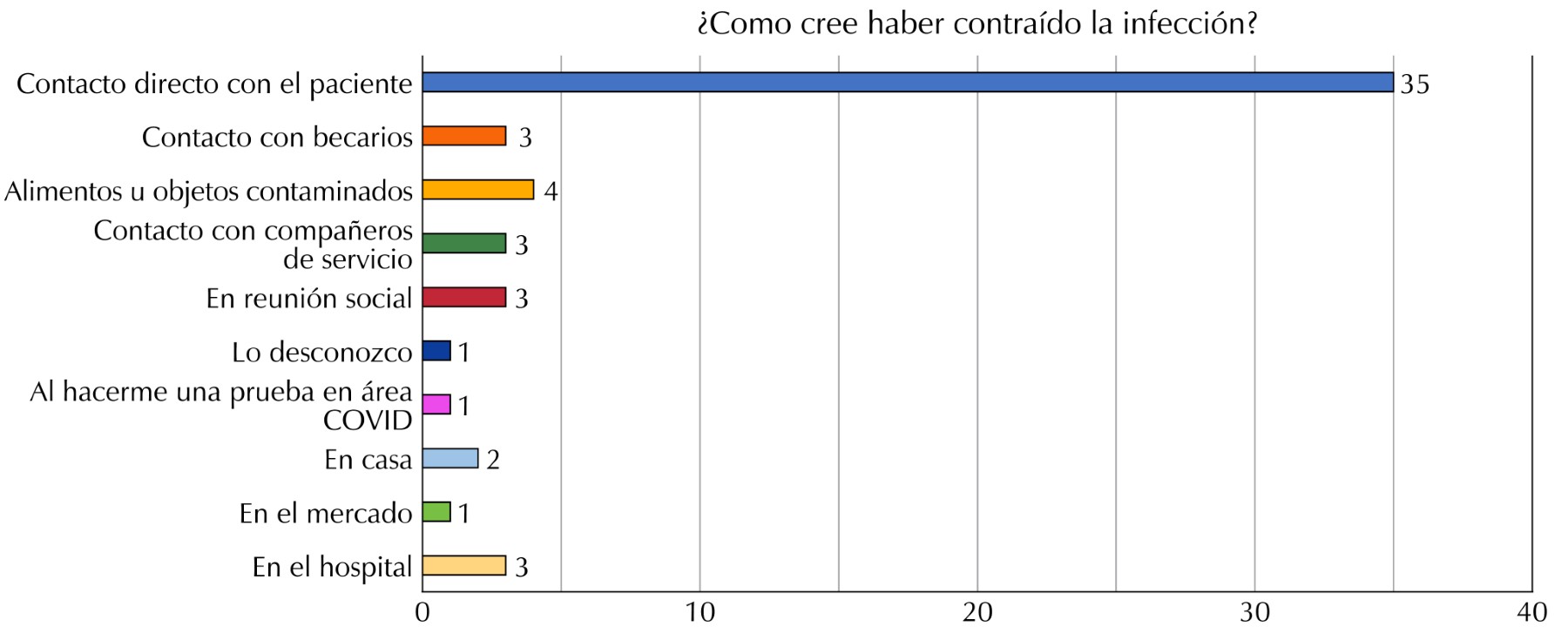 Con objeto de evaluar el enfrentamiento médico de la pandemia por COVID-19, se aplicó una encuesta en línea a los médicos afiliados a la Sociedad Médica del AHCGFAA. Participaron en la encuesta 82 médicos, 50 (61.7%) hombres y 31 (38.3%) mujeres. El número de médicos por área fue; adultos 50, pediatría 12 y otras áreas 19, estos últimos con funciones de gestión, enseñanza-administración. El número de médicos por cada turno fue: 50 del turno matutino, ocho del turno vespertino y 15 de la jornada acumulada. Todos respondieron como creían haber contraído la infección (Figura 1).
