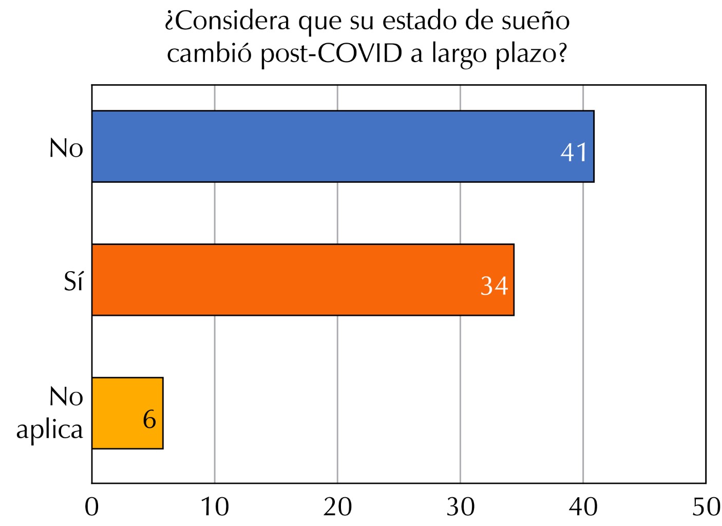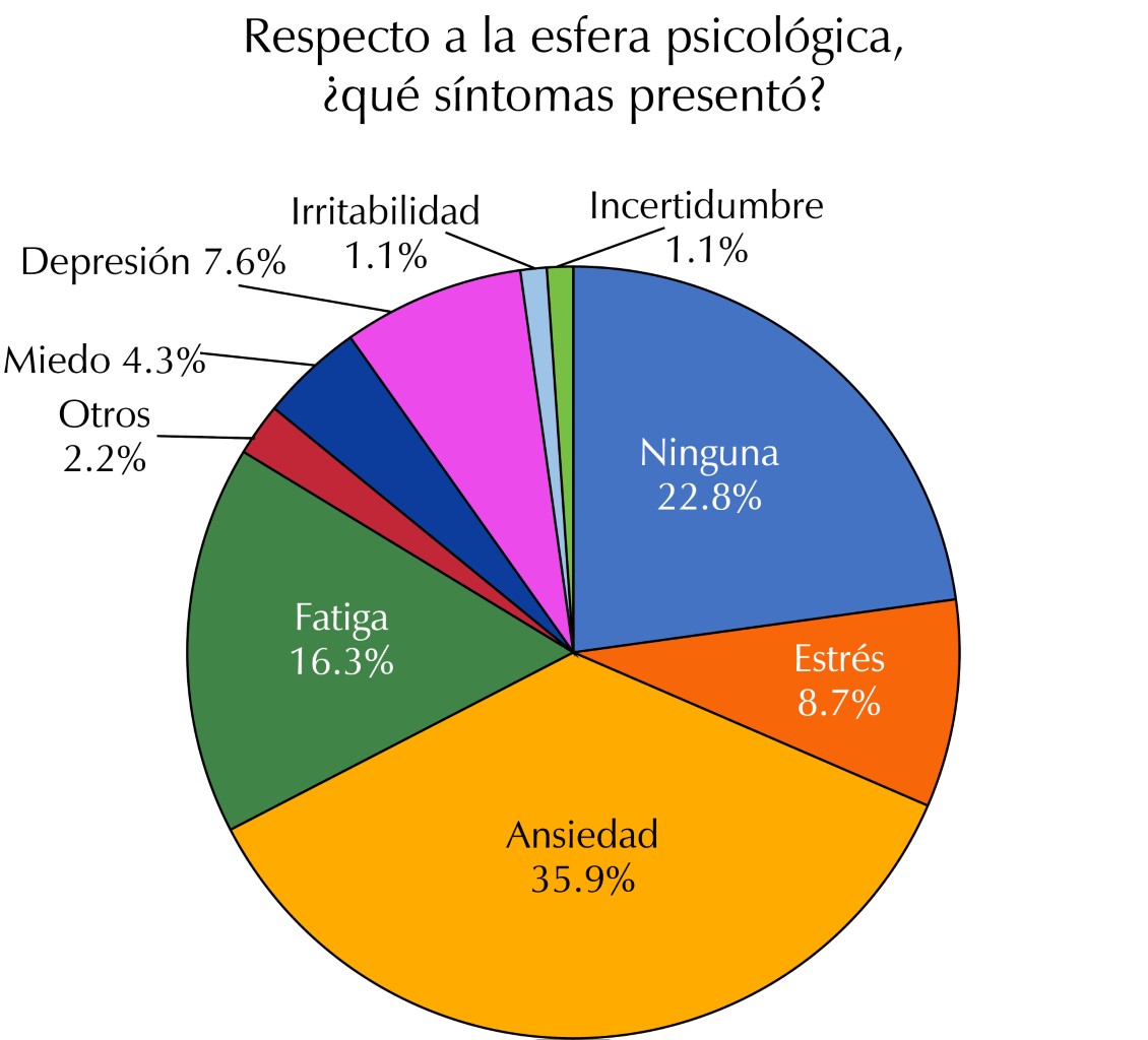 En el sistema nervioso se reflejaron síntomas que afectan el estado general. La esfera cognitiva y mental tuvo como respuestas, fatiga en 42 casos (68.9%), cefalea en 44 casos (72.1%) y pérdida de la memoria en seis casos (9.8%). Los resultados demostraron como secuelas la persistencia de ansiedad, insomnio e incluso pérdida de la memoria en algunas personas. En estos resultados el estrés residual y la depresión también fueron manifestados en 31 casos (38.3%), una condición similar a la reportada por Scatolaro, quien reportó 34% de depresión y 38% de burnout.