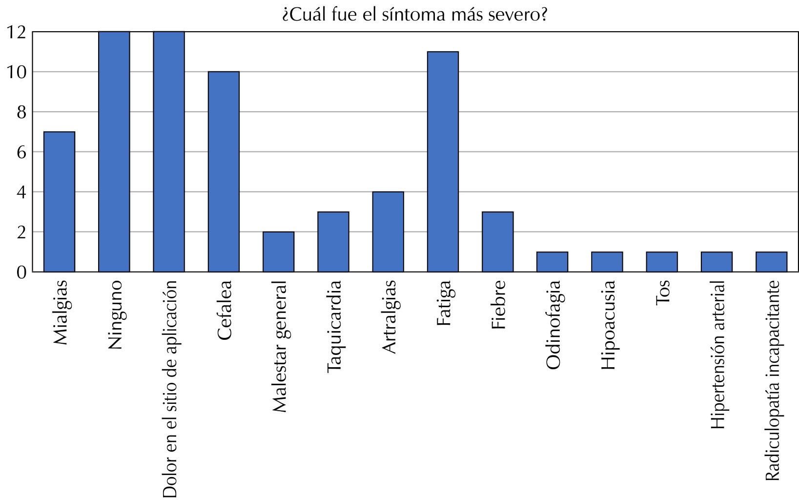 Respecto a la vacunación, la totalidad de los participantes (100%) en la encuesta recibieron la primera dosis de la vacuna, todos de la marca Pfizer; la segunda dosis la recibieron 97.5% de los participantes que fueron los que completaron el esquema de vacunación, en esta segunda dosis las marcas fueron, Pfizer 51 (62.9%), AstraZeneca 27 (33.3%), dos (2.4%) Moderna y uno (1.2%) Johnson & Johnson. Por otro lado, 78 encuestados (96.2%) estuvieron de acuerdo en continuar recibiendo vacunación, a pesar de que 79% presentó alguna molestia al haberse vacunado, puede verse el tipo y frecuencia de dato clínico informado (Figura 4).