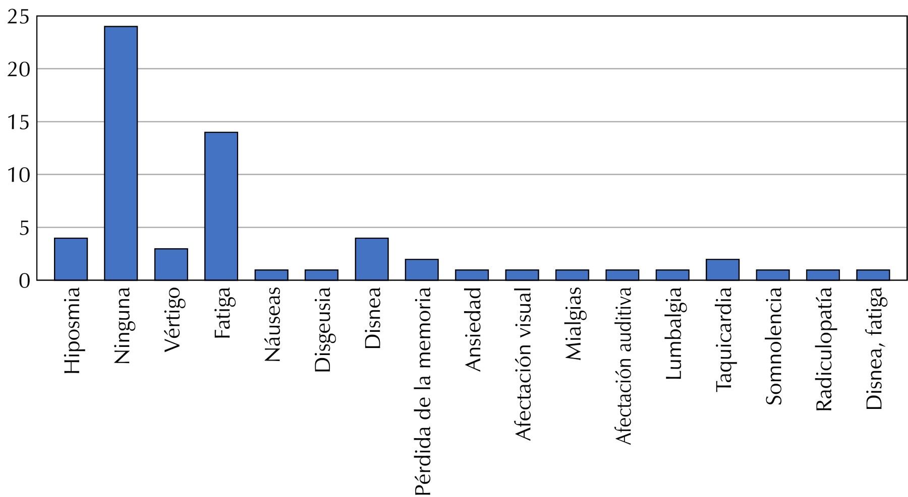 De la población que respondió la encuesta, 56 (69.1%) presentaron COVID-19 y 25 (30.8%) no lo presentaron o no se dieron cuenta. En 69% hubo síntomas de afección respiratoria con tos, odinofagia, malestar general, cefalea y fiebre, cinco de ellos (6.09%) refirieron alteración cardiovascular con taquicardia, además de cinco (6.09%) pérdida de la memoria, cuatro (4.80) erupciones o manchas en la piel, dos (2.4%) vértigo, uno (1.2%) radiculopatía y otro (1.2%) hemorragia uterina disfuncional.