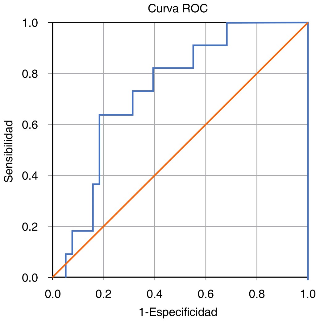 Se realizó una curva ROC para encontrar un punto de corte con valores de troponina de 50 ng/dL con una sensibilidad de 73% para predecir muerte. Se determinaron los OR para los resultados de troponina de 6.6 para muerte con un IC de 95% (1.24-34.9) (Figuras 1 y 2).