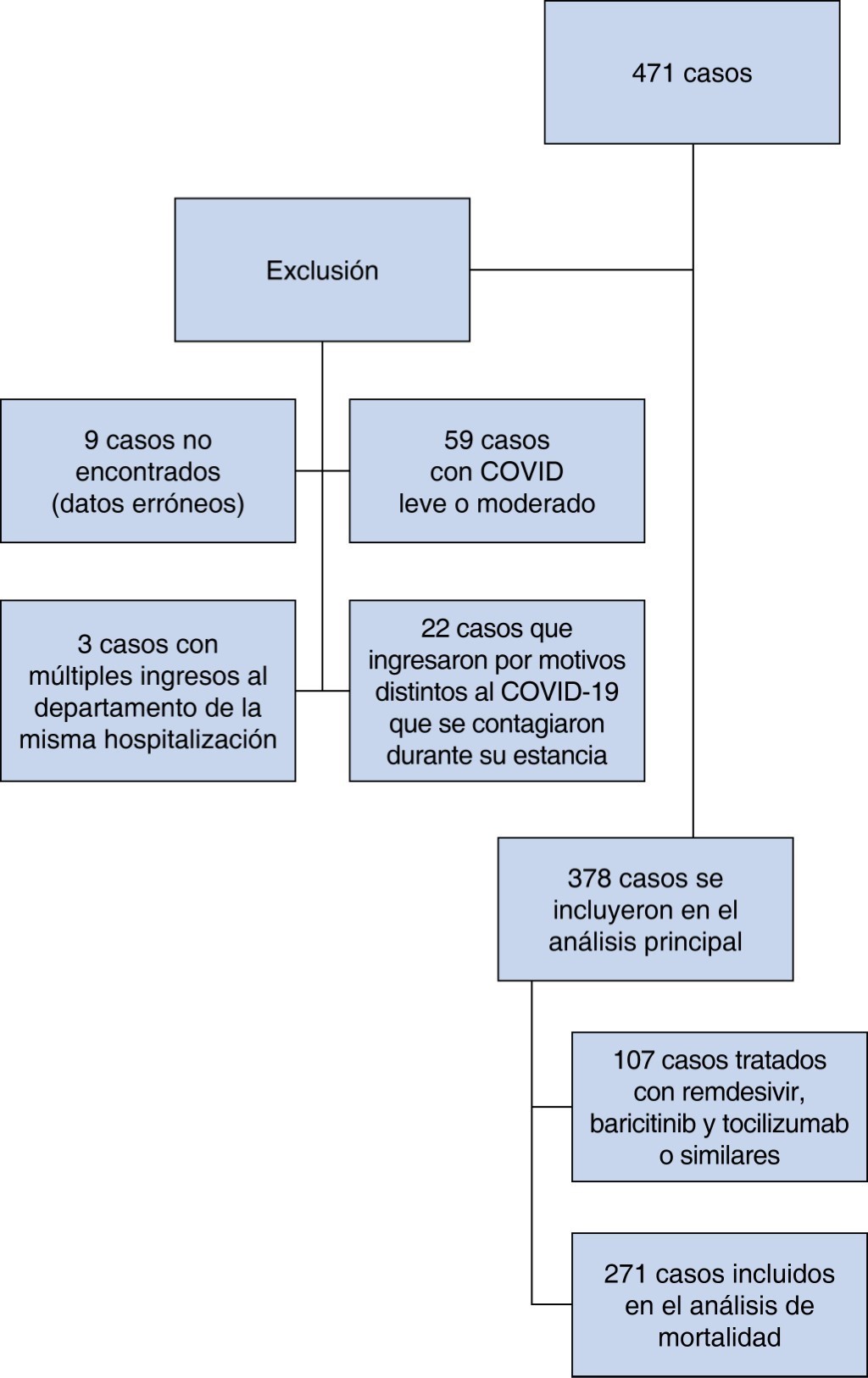 En el periodo comprendido desde el 1o de enero de 2020 hasta el 31 de diciembre de 2021 se registró el ingreso al área de aislamiento COVID-19 del Departamento de Medicina Intensiva del Hospital Central Militar de 471 casos, cuyos expedientes clínicos fueron sometidos a escrutinio con el fin de valorar los criterios de inclusión, exclusión y eliminación, quedando como se expresa en la Figura 1.