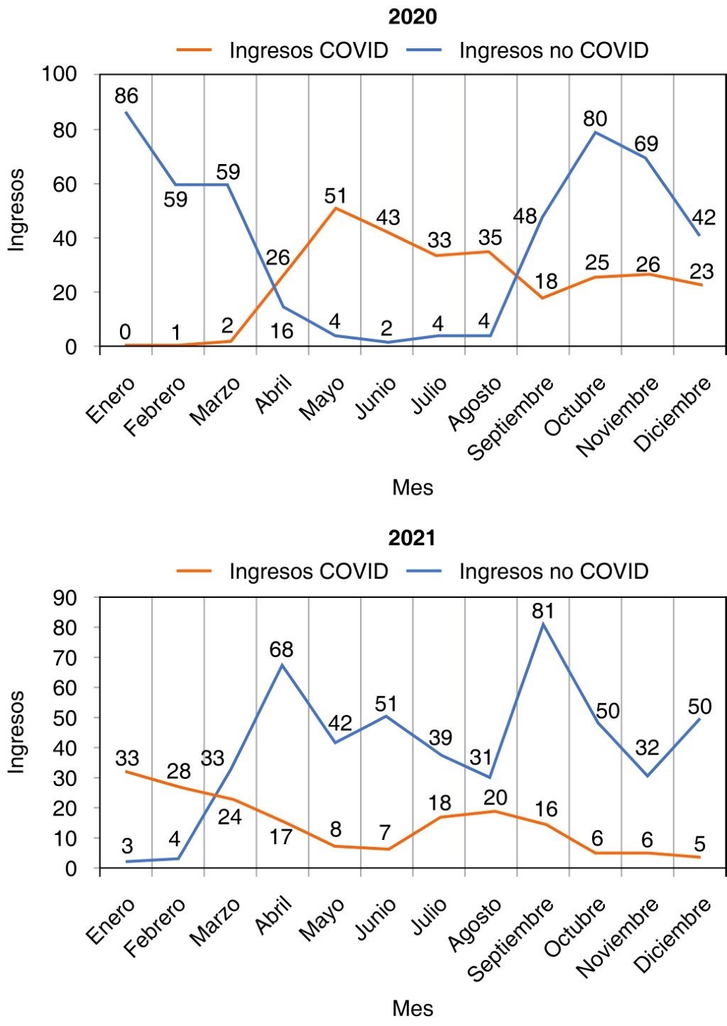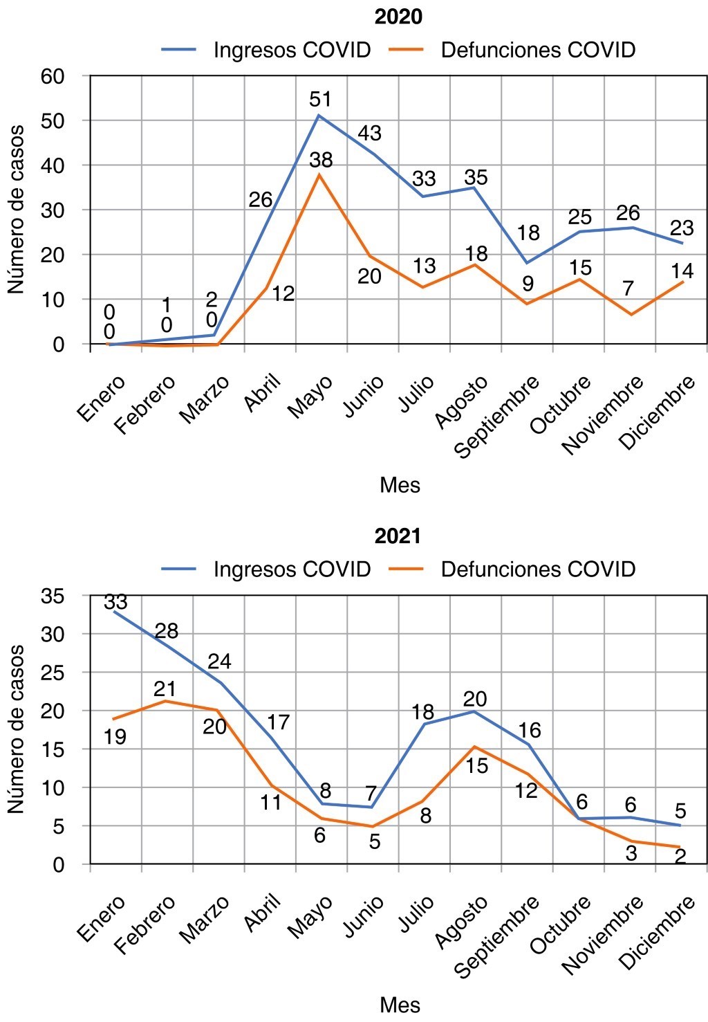En el periodo comprendido del 1o de enero de 2020 al 31 de diciembre de 2021 ingresaron al departamento de medicina intensiva 1,428 pacientes, de los cuales 471 se encontraron dentro del área COVID-19, se registraron 274 defunciones en este sector, lo cual determinó la mortalidad de los pacientes de COVID-19 para la terapia intensiva de nuestro hospital en 58% (Figuras 2 y 3).