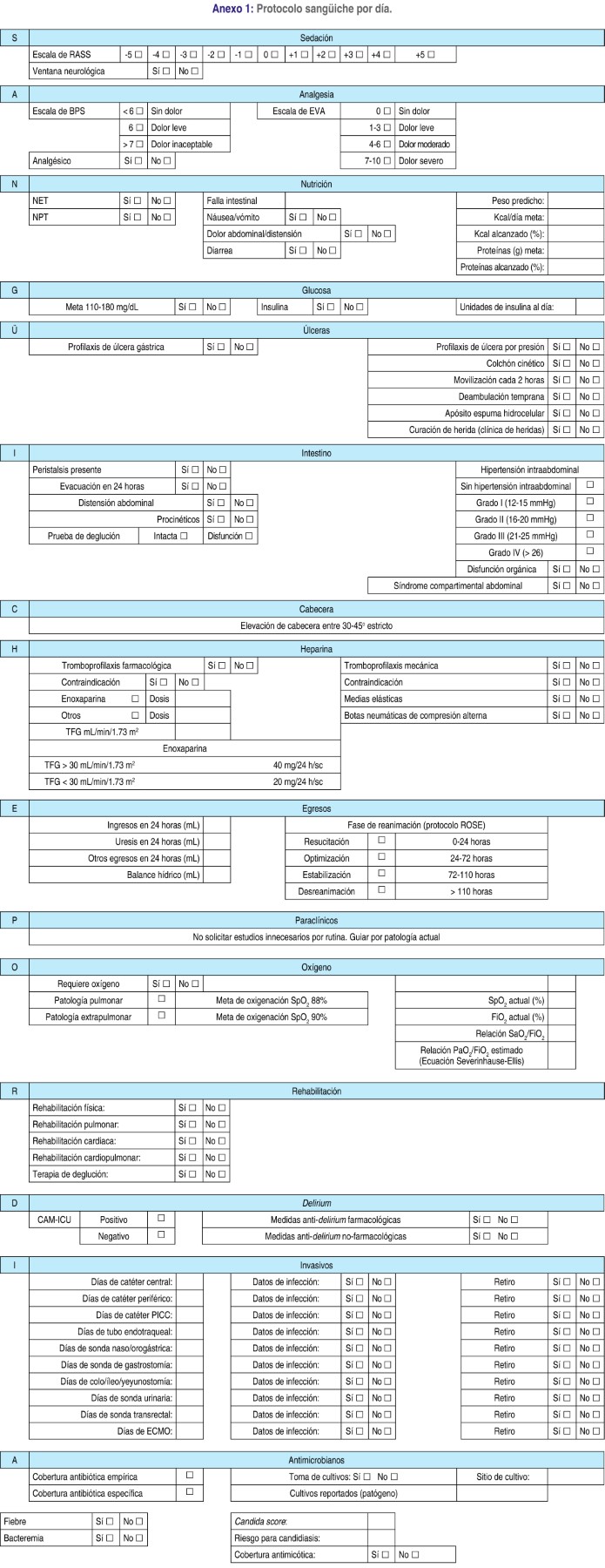 En el Anexo 1 se muestra nuestra sugerencia para un chequeo integral, se propone una lista de verificación para mantener un estándar de calidad en el cuidado del paciente crítico en cada UCI.