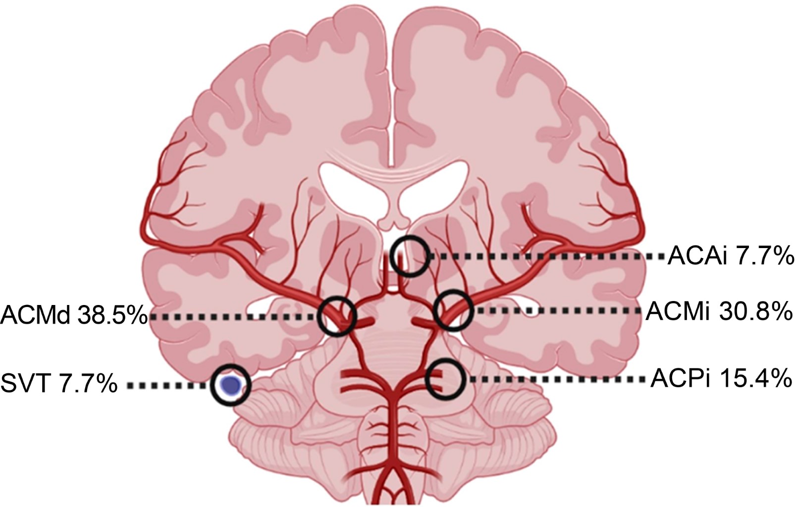Se recopiló un total de 16 expedientes con la información deseada completa, obteniendo una muestra constituida por siete mujeres (43.8%) y nueve hombres (56.2%); con una edad promedio de 77.5 años, una calificación promedio de la escala NIHSS de 20.25 puntos a su ingreso al servicio de urgencias. Se observó una diferencia de tiempo entre el último momento que el paciente o un familiar lo reportaron como en buen estado y hasta acudir al servicio de urgencias de 266.6 minutos en promedio, considerando únicamente a 10 (62.5%) de los pacientes que contaban con este tiempo registrado en su expediente. Sólo cuatro (23.5%) de los pacientes contaron con puntaje inicial de NIHSS, con un puntaje promedio de 20.25 puntos, pero ningún paciente contó con puntaje de seguimiento. Contaban con el antecedente de otra EVC tres pacientes (18.8%), todos en los últimos cinco años previos a su ingreso; por otro lado, ninguno de los pacientes desarrolló un nuevo cuadro isquémico durante su estancia intrahospitalaria. Tras decidir su ingreso hospitalario, los pacientes fueron asignados a cargo de diferentes servicios médicos de especialidad, como lo muestra la Tabla 1, siendo medicina interna el servicio que recibió la mayor cantidad de pacientes (25%). A su llegada, 12 (75%) de los pacientes se sometieron a una TC simple de cráneo, seis (37.5%) recibieron una resonancia magnética de cráneo y dos (12.5%) se sometieron a ambos estudios de neuroimagen en las primeras 24 horas, presentando un tiempo puerta-imagen promedio de 120 minutos. Se muestran las principales estructuras vasculares afectadas en la Figura 1. Respecto al tratamiento, sólo un paciente (6.3%) recibió trombectomía mecánica en arteria cerebral media izquierda y se administró alteplasa 6.8 mg, quien fue admitido en la unidad de terapia intensiva (UTI); paciente masculino de 33 años de edad de ascendencia asiática, que presentó una crisis hipertensiva tras consumo de sustancias de abuso. Sólo un paciente concluyó en defunción (6.3%). El resto de los pacientes recibieron diversos tratamientos paliativos, donde la rehabilitación física y profilaxis secundaria fueron las principales conductas terapéuticas. Al comparar factores como edad (p = 0.586), sexo (p = 0.5), tiempo de búsqueda de atención (p = 0.125) o recurrencia de EVC (p = 0.813) no se encontraron diferencias estadísticamente significativas entre quienes recibieron o no la trombectomía; sin embargo, la muestra no resultó ser significativa. El paciente que recibió trombectomía presentó buena evolución clínica y fue dado de alta hospitalaria a las 72 horas para seguimiento por consulta externa; sin embargo, no se cuenta con datos objetivos de su evolución en su expediente clínico.