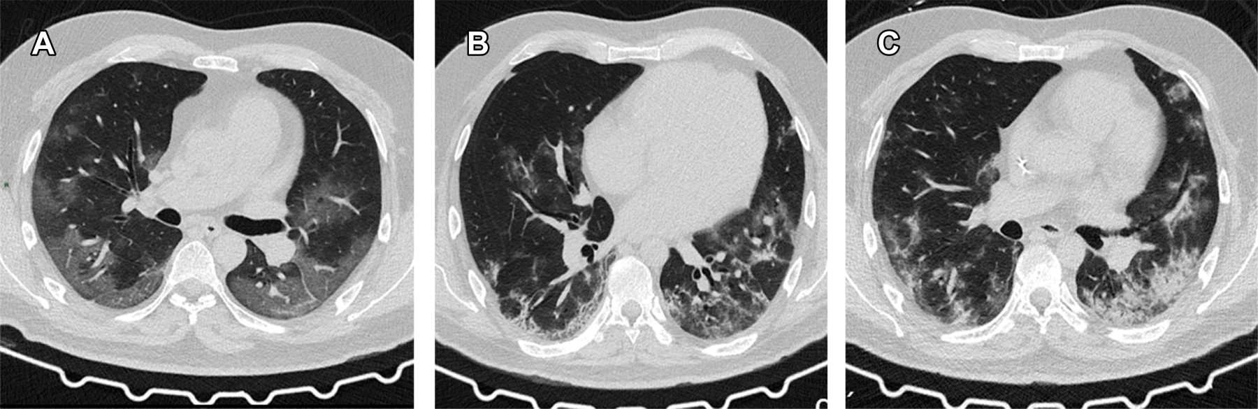 Los hallazgos tomográficos comúnmente observados en pacientes con COVID-19 son la expresión del daño pulmonar intersticial agudo y cambios parenquimatosos resultantes del proceso inflamatorio que condicionan opacidades en vidrio despulido por afectación intersticial, en algunas ocasiones asociado a engrosamiento septal. Conforme avanza la enfermedad pulmonar se observan áreas de consolidación parenquimatosa como complicación, estos datos coinciden con los pacientes reportados en este artículo, donde el principal hallazgo tomográfico fue el vidrio despulido en la mayoría de los pacientes, seguido del patrón adoquinado (crazy paving) y áreas de consolidación.11